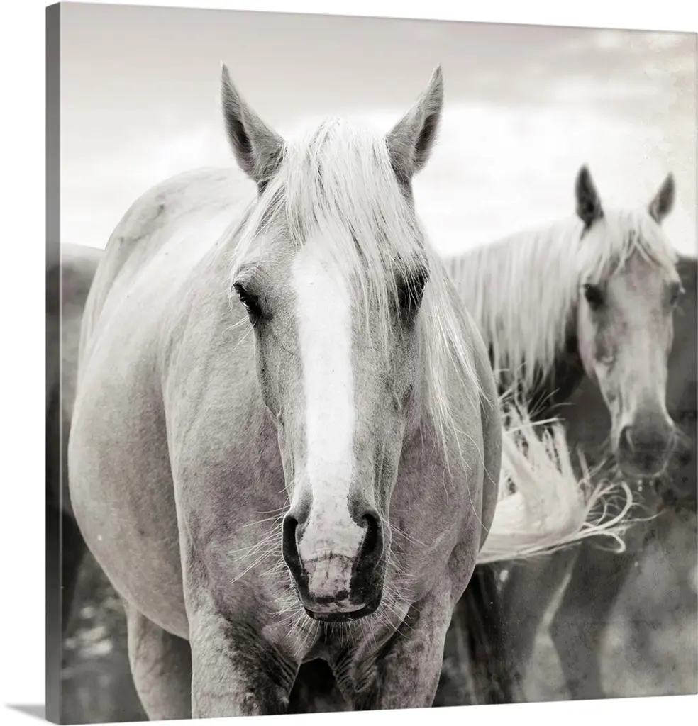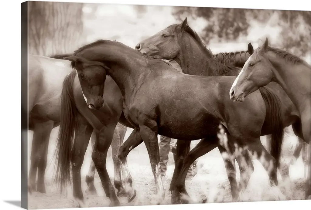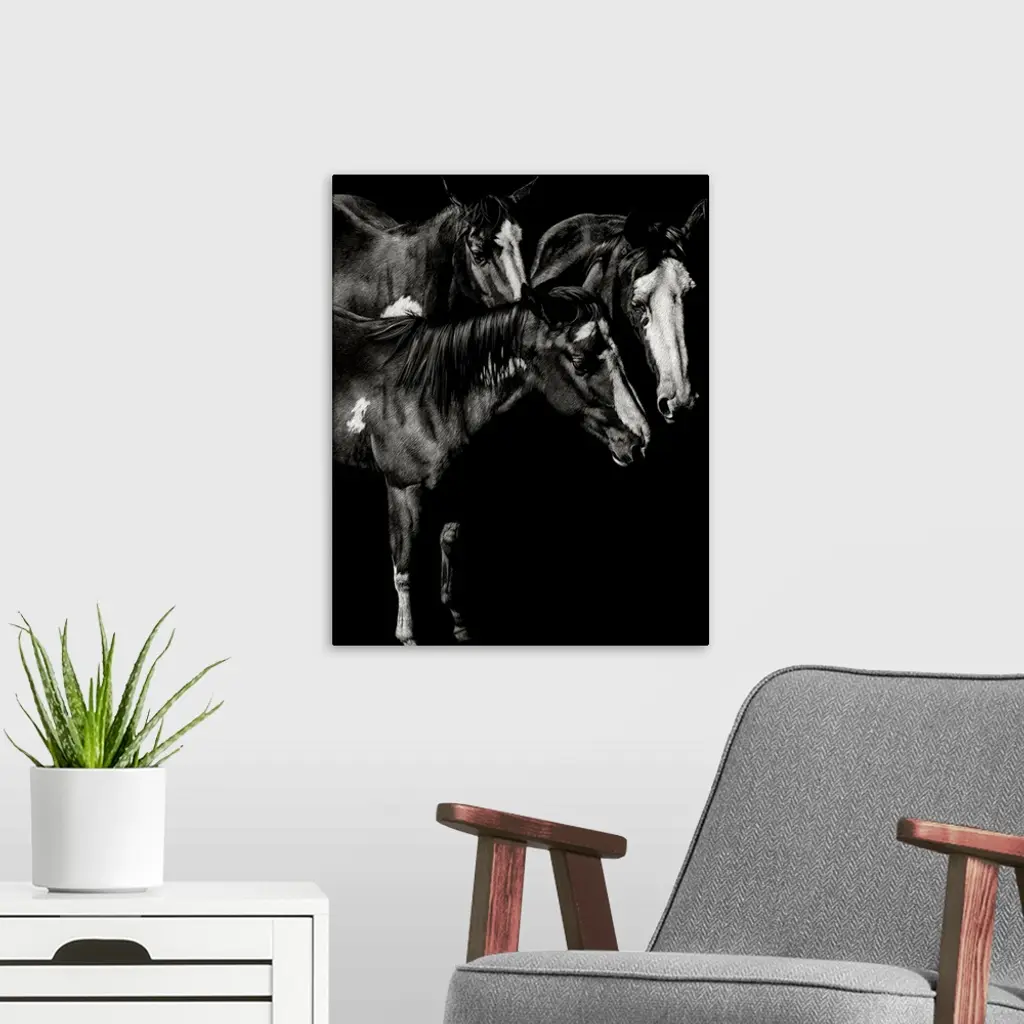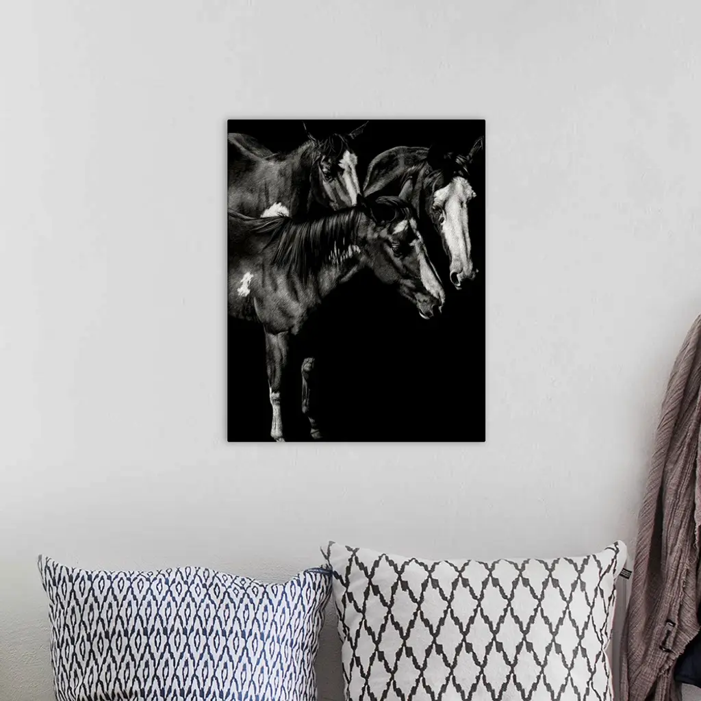 Black and white illustration of three horses standing together.