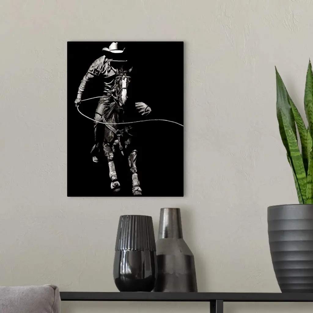 Black and white lifelike illustration of a cowboy riding a horse with a lasso.
