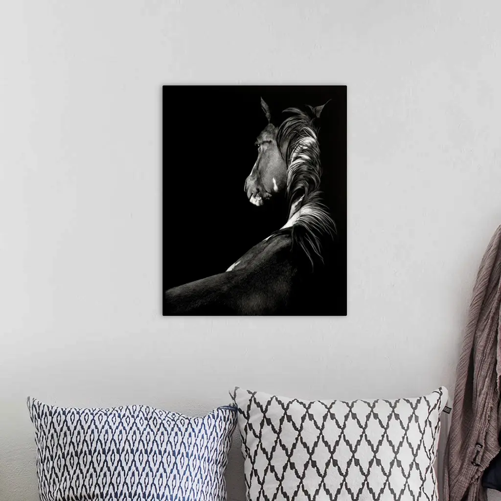 Black and white illustration of a horse seen from the back.