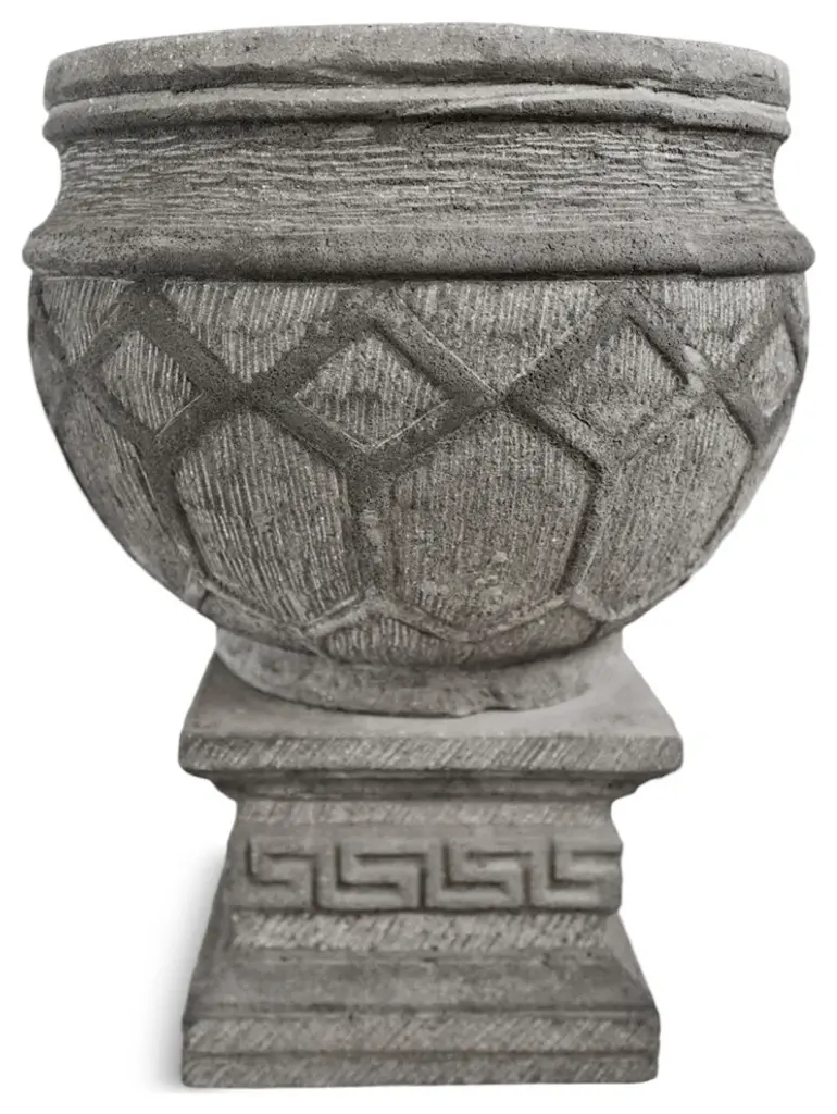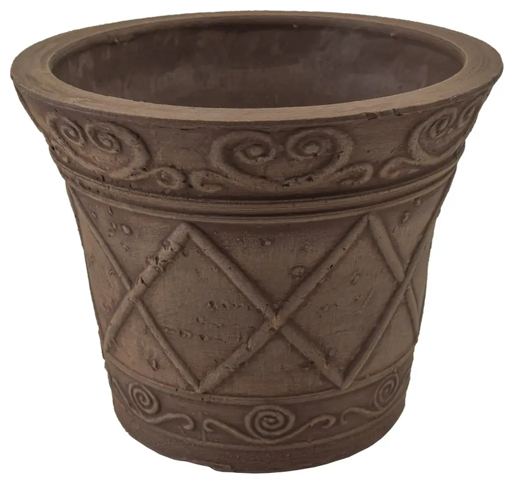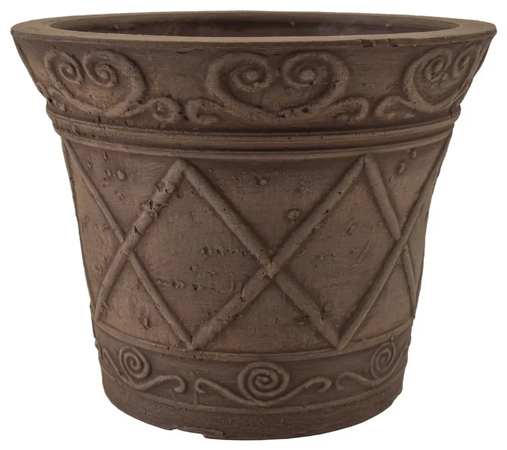 Showcase your favorite flowers and greenery in the elegant, ecofriendly Scroll Grower Pot. Made from a mix of recycled polymer, stone powder, and wood dust, this brown pot is lightweight, weather-resistant, and durable. Its carved scroll and diamond designs give it a traditional feel.