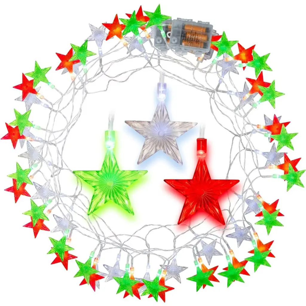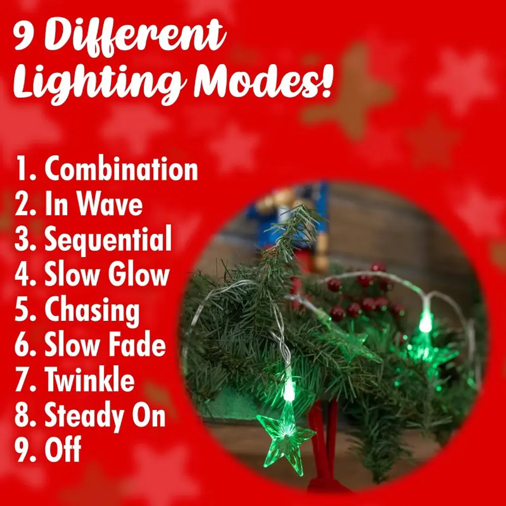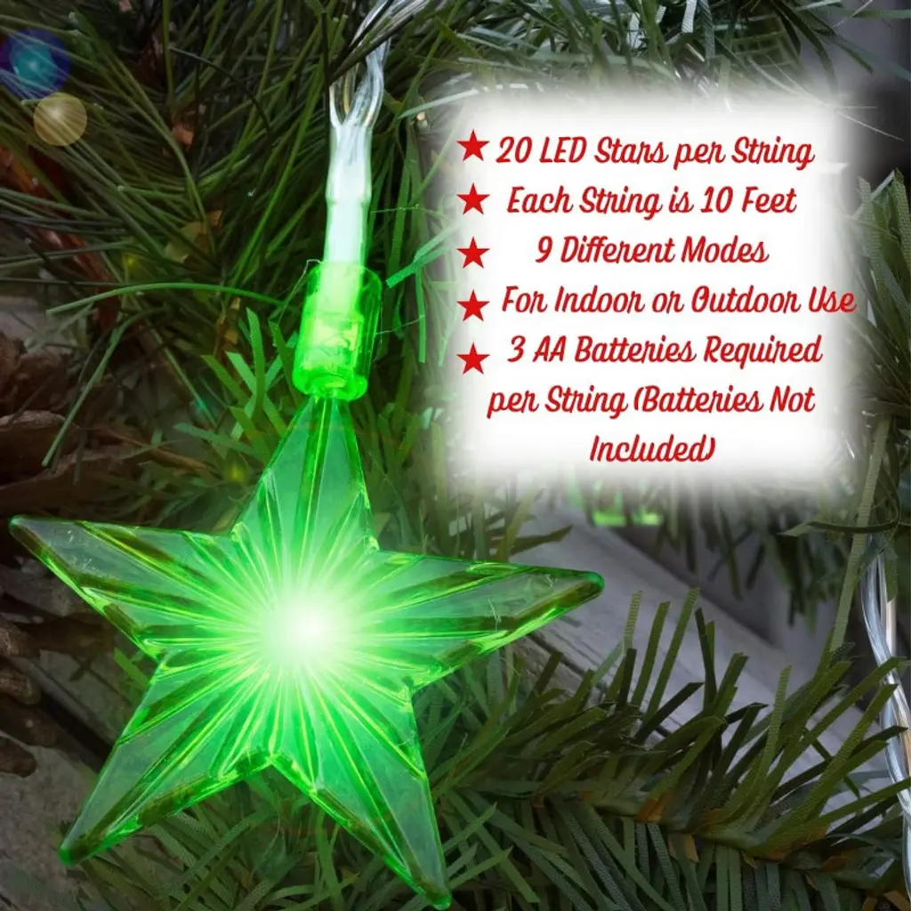 Elevate your holiday decor with this delightful set of Christmas Star String Lights! This 3-pack features 10 feet (3 meters) of enchanting lighting in festive red, green, and clear colors. Each strand is adorned with 20 LED fairy lights that offer nine captivating lighting modes, including twinkle, steady, and slow glow, adding a magical touch to your indoor or outdoor Christmas and holiday party decorations. With a waterproof battery pack, you can confidently use them outdoors, even in wet conditions. Illuminate your festivities with these charming star-shaped lights and create a warm and inviting atmosphere for your seasonal celebrations.