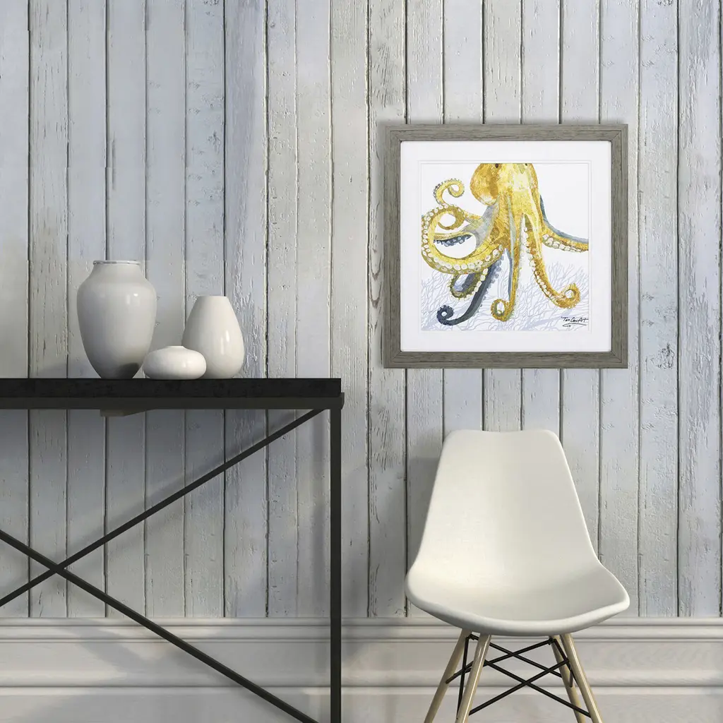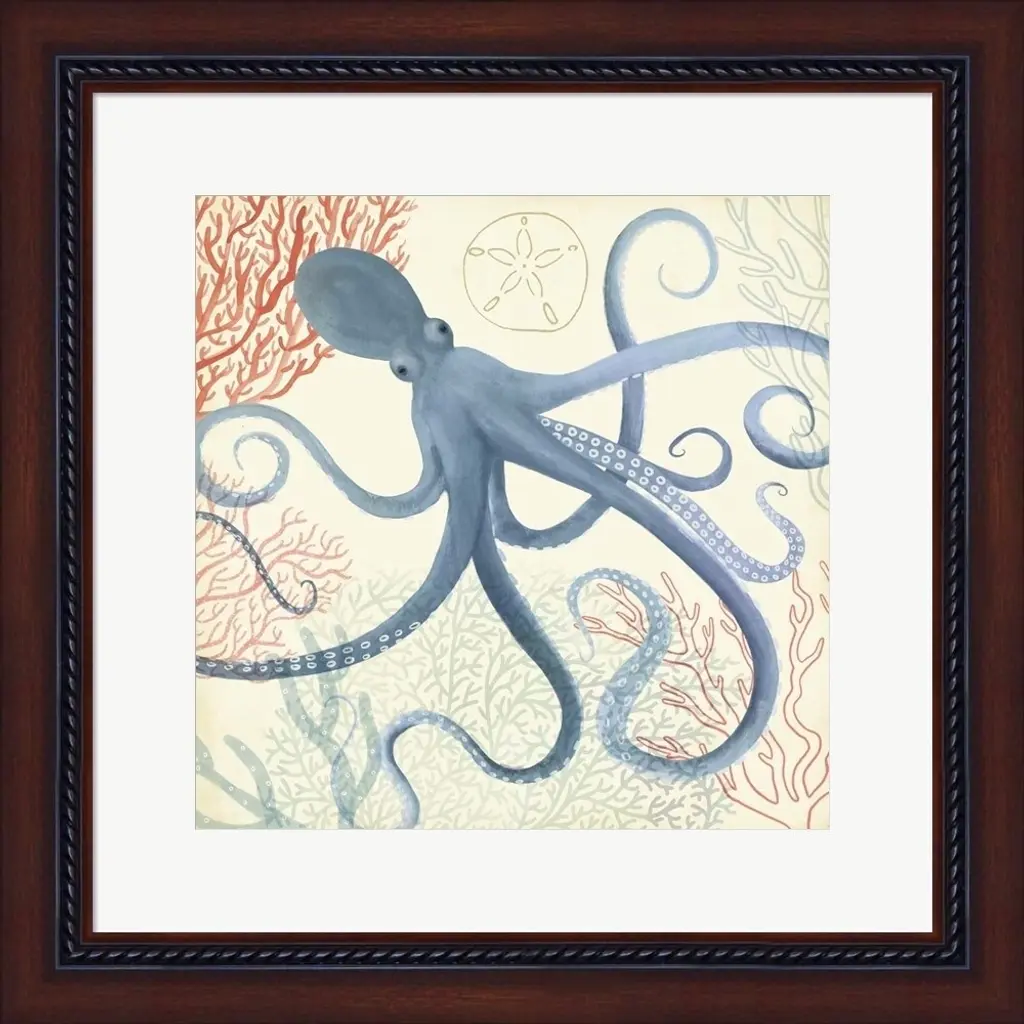 Beautiful octopus image that has been double matted in white and framed under glass in a repurposed wood look moulding.