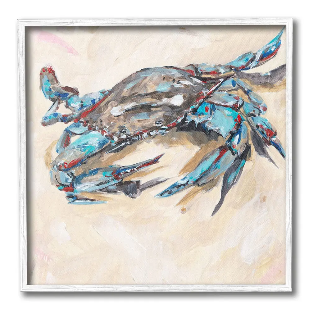 Beautiful crab image that has been double matted in white and framed under glass in a repurposed wood look moulding.