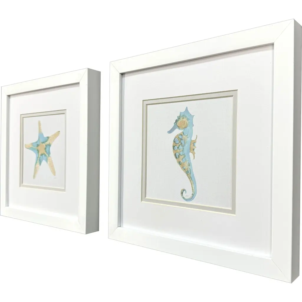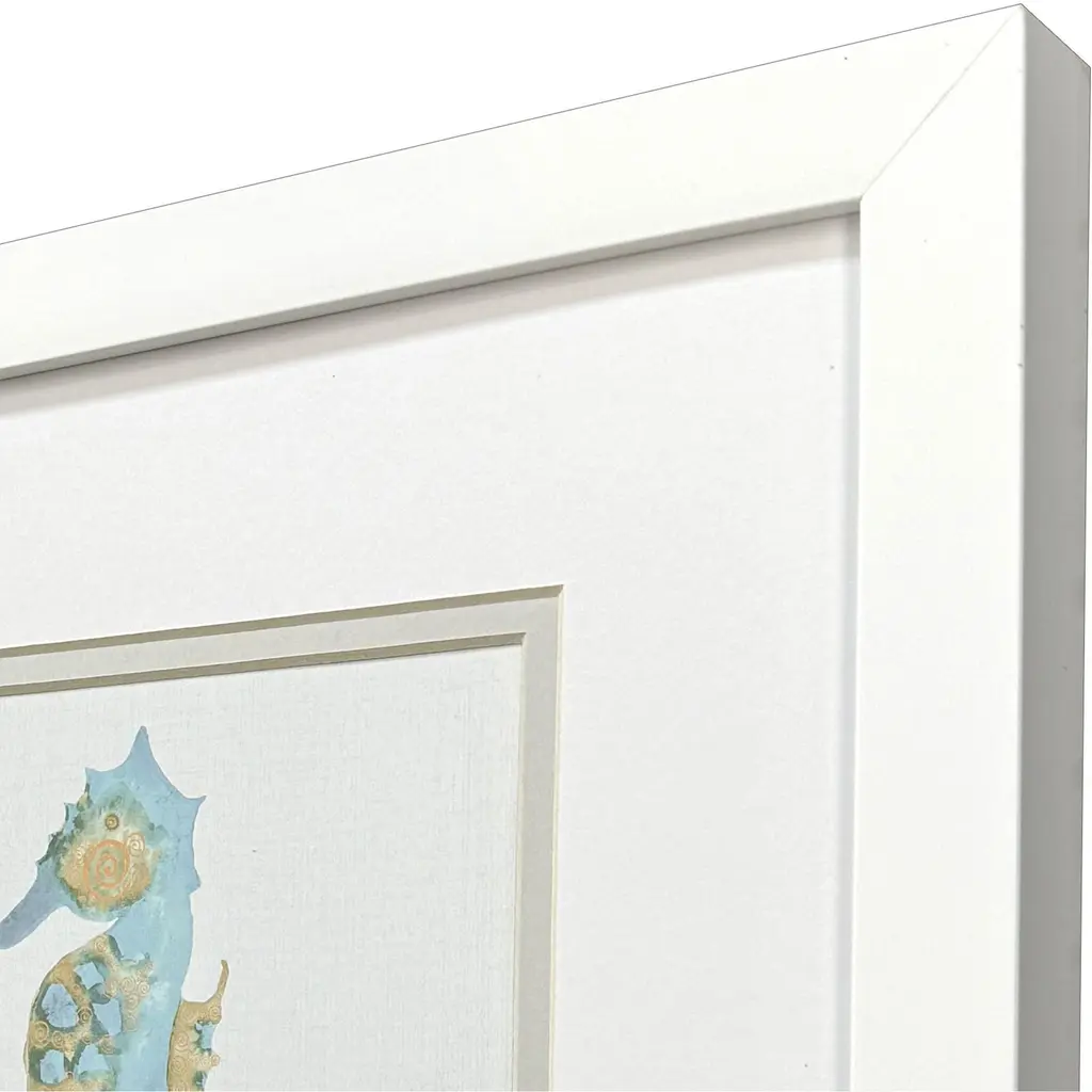 Patterned ocean critters display a lighthearted appearance. Matted in white and framed in a modern flat profile molding in a white matte finish.