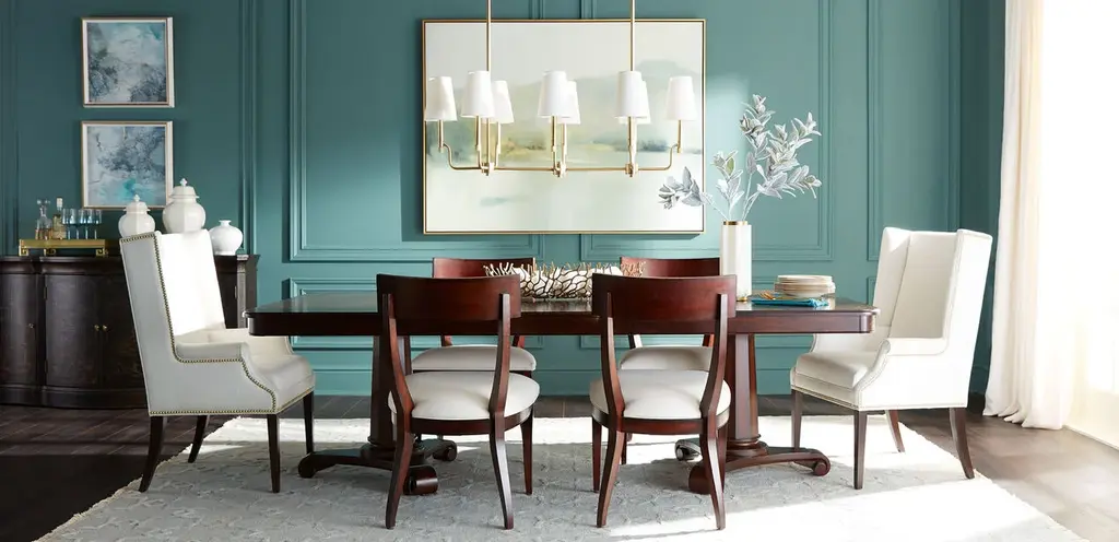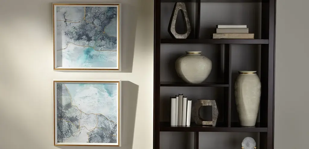 Shades of blue from teal to navy create a ripple effect when combined with a white background and gold embellishments. The result is a pair of art prints that resemble the ocean's surface, which gives rooms an elevated coastal feel.
