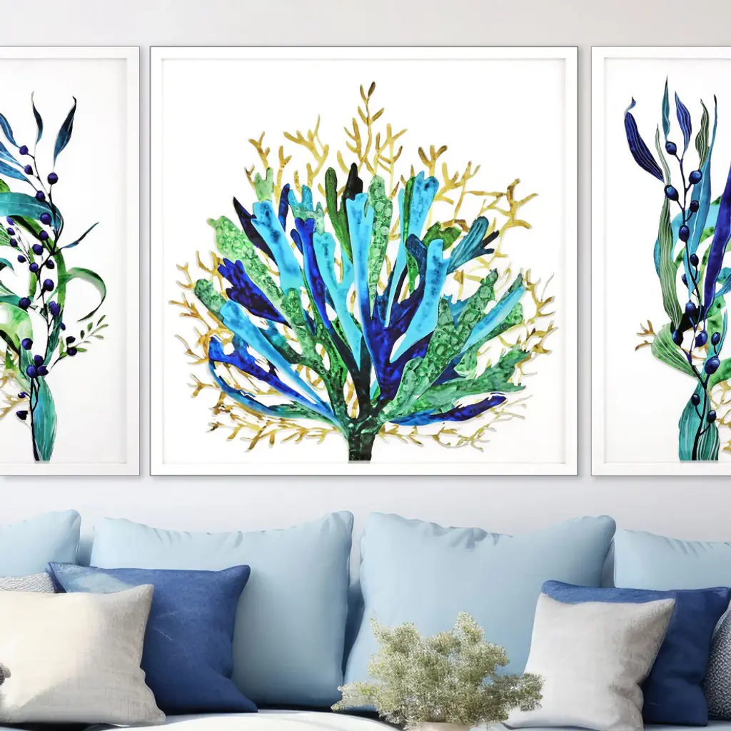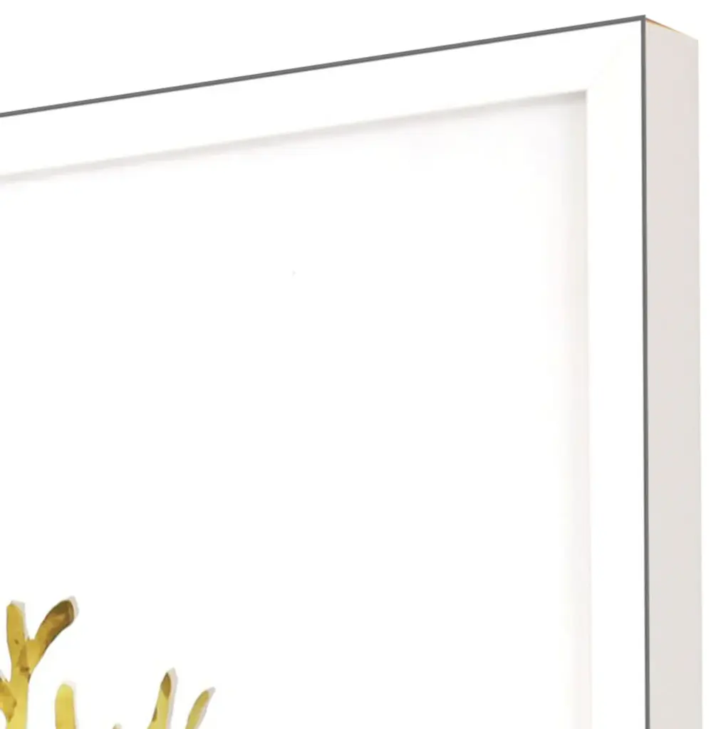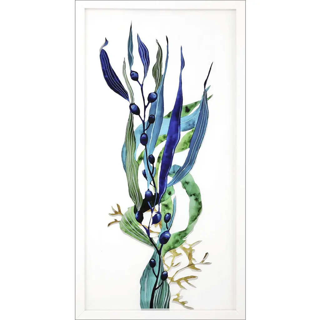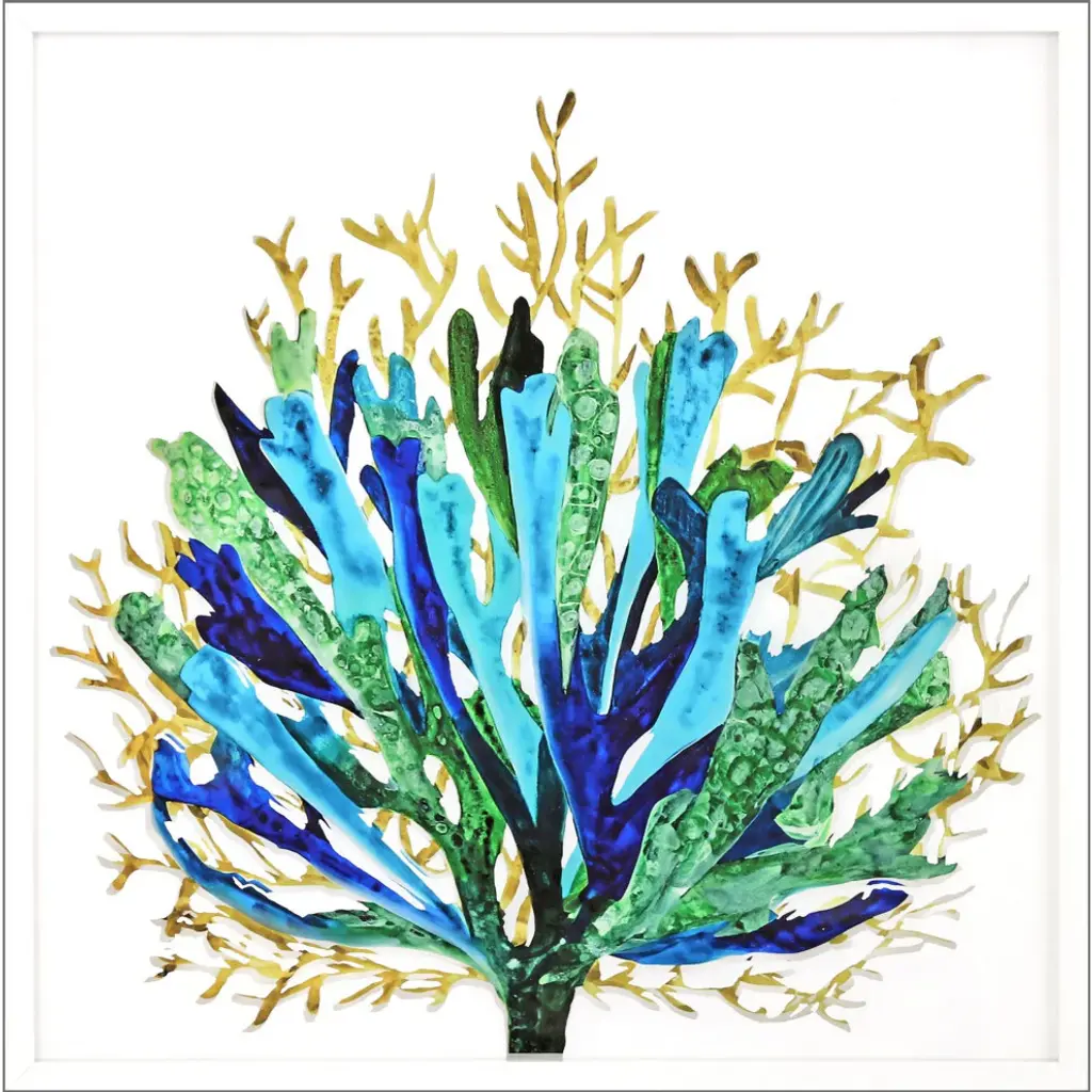 Exclusive mixed media shadow box with hand painted acrylic overlay. Framed in a lacquered white wood shadow box style moulding.