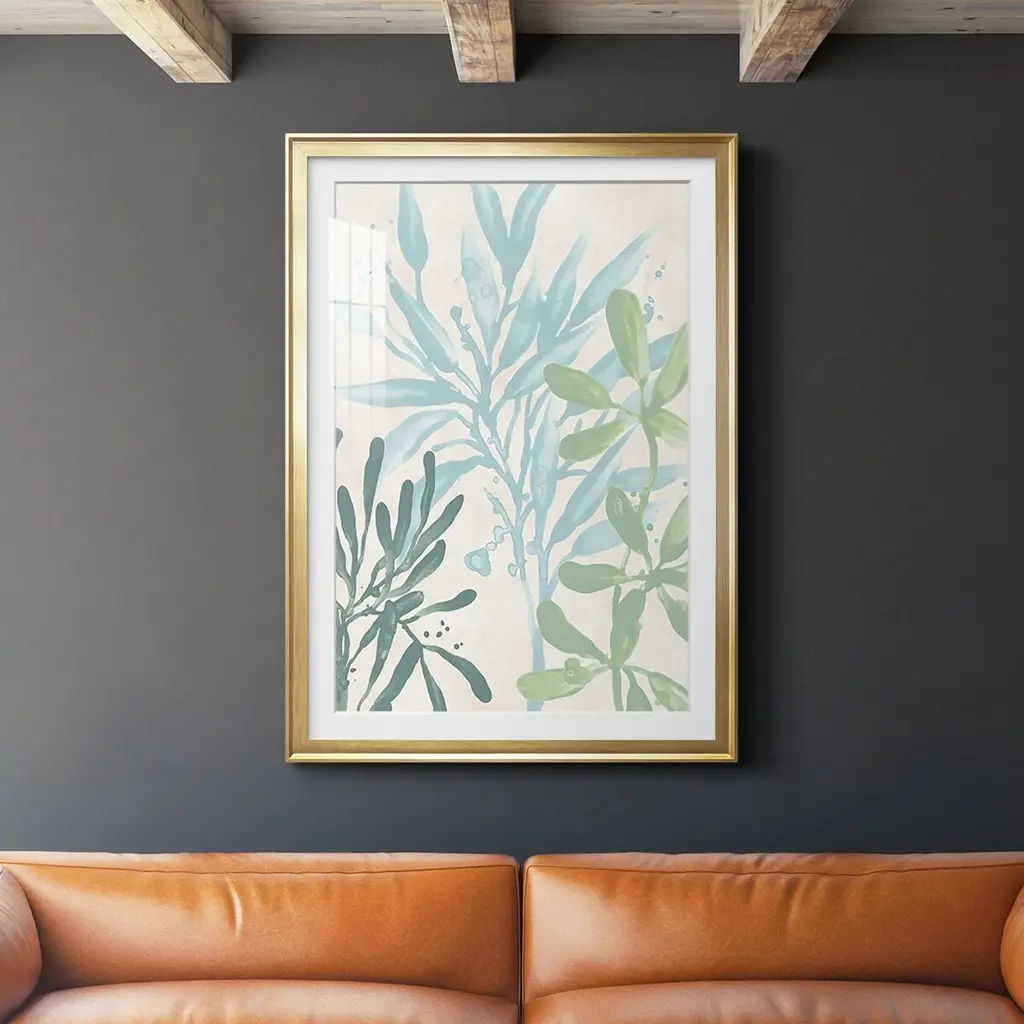 Tangled seaweed is matted in white and framed in champagne finish moulding.