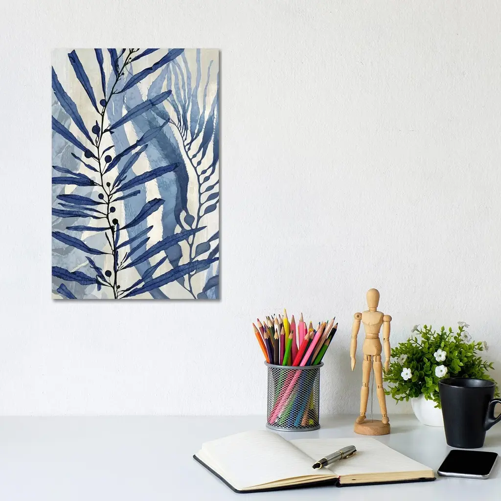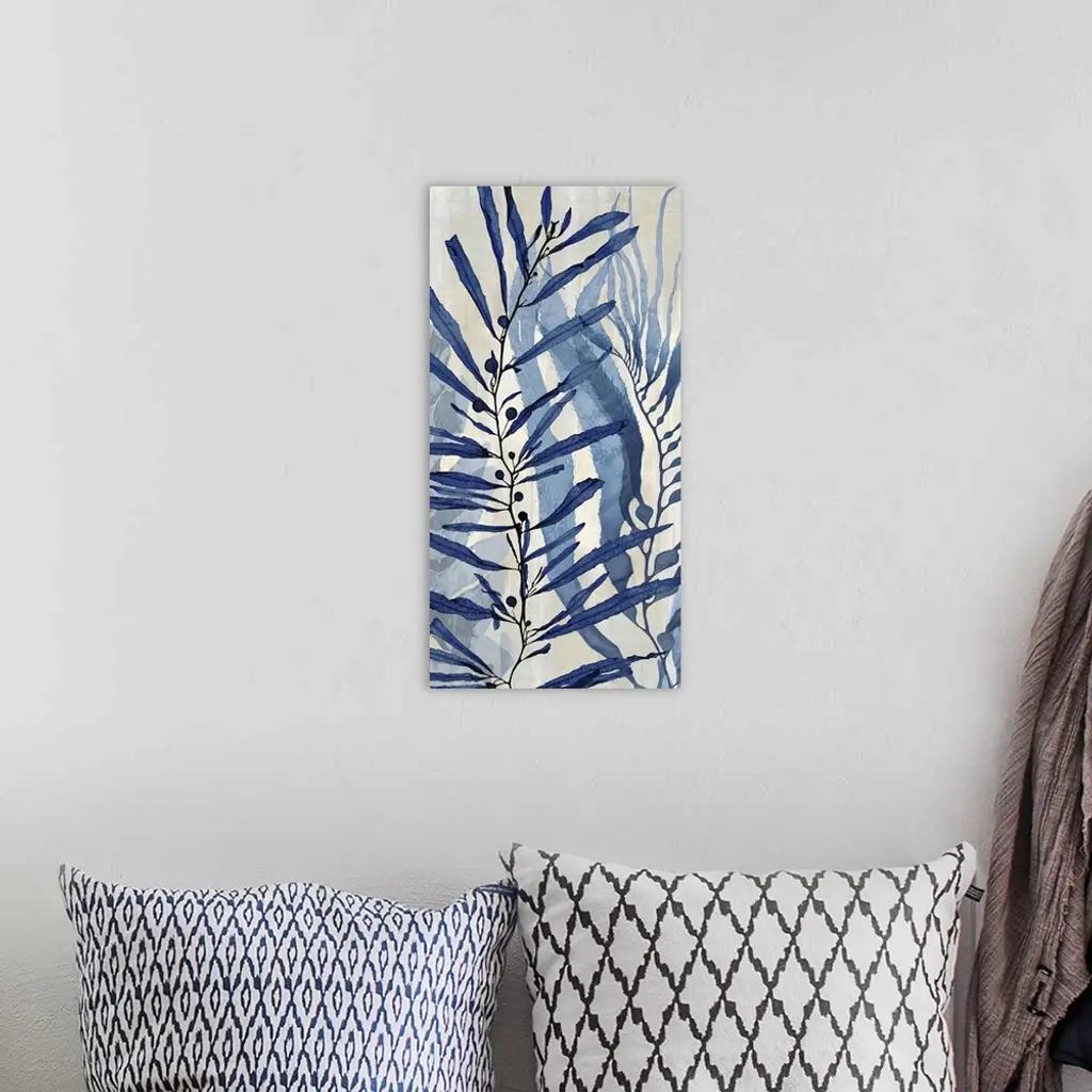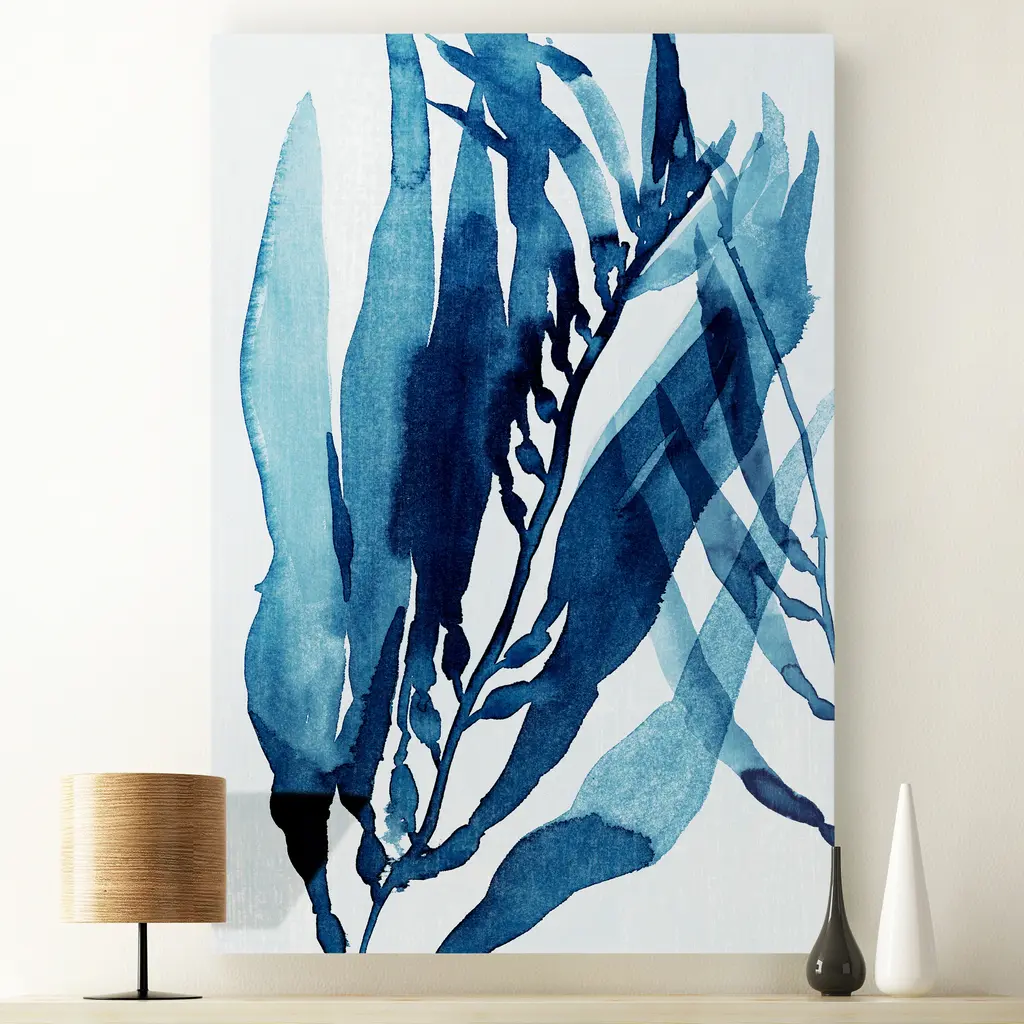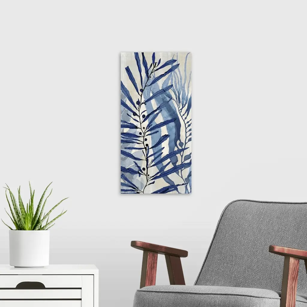 Beach themed decor with indigo sea vegetation on a gray and tan background.