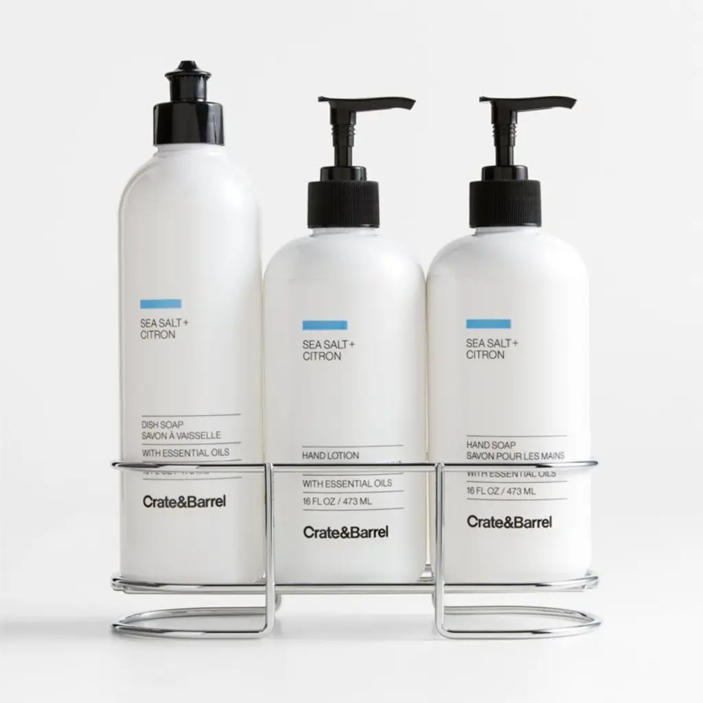 Wash dishes and clean and soothe hands with the fresh, clean fragrances of sea salt and citron featured in this exclusive four-piece set. Our dish soap tackles grease and residue with ease. Once the dishes are done, our hand soap moisturizes with sunflower seed oil and aloe vera as it cleans, while the hand lotion boasts mango seed oil and aloe. All three are made with plant-based formulas scented with essential oils that leave behind the invigorating aromas of lemon and bergamot against a backdrop of floral and earthy scents. Stainless steel curves the three-bottle caddy for a look that's neat and modern.View all "The Kitchen by Crate" collection