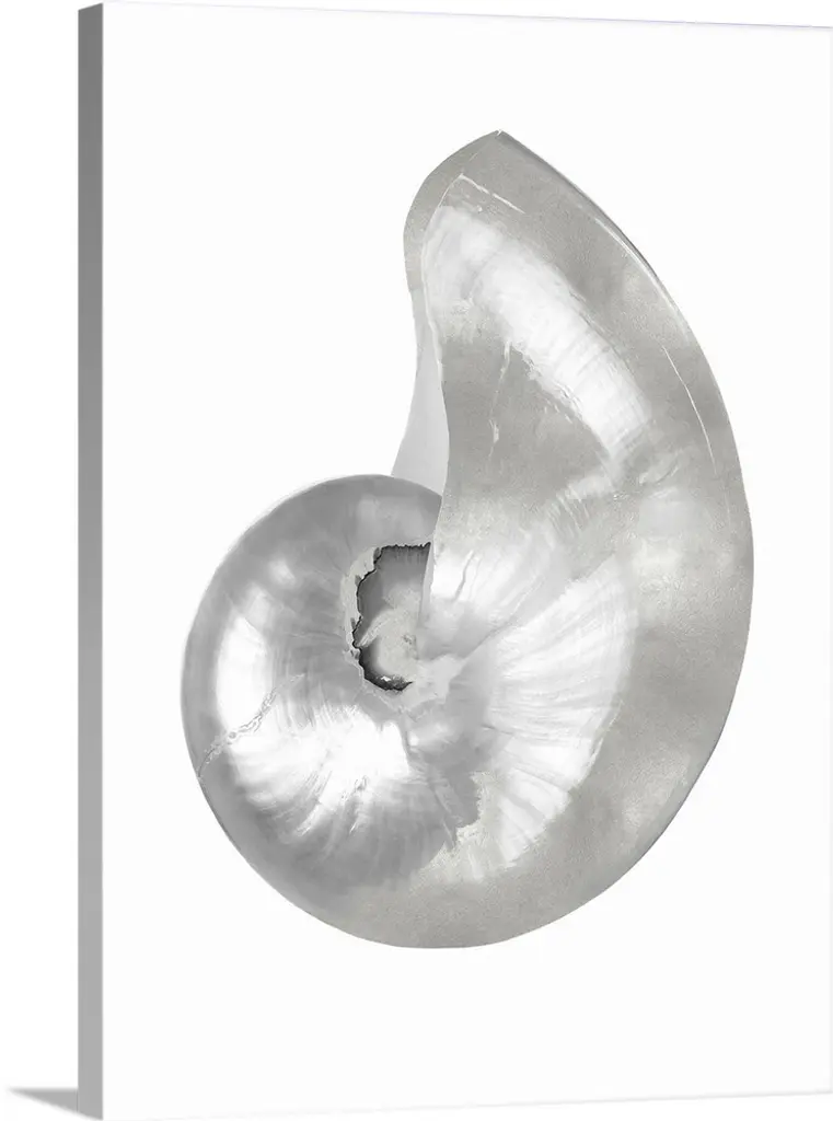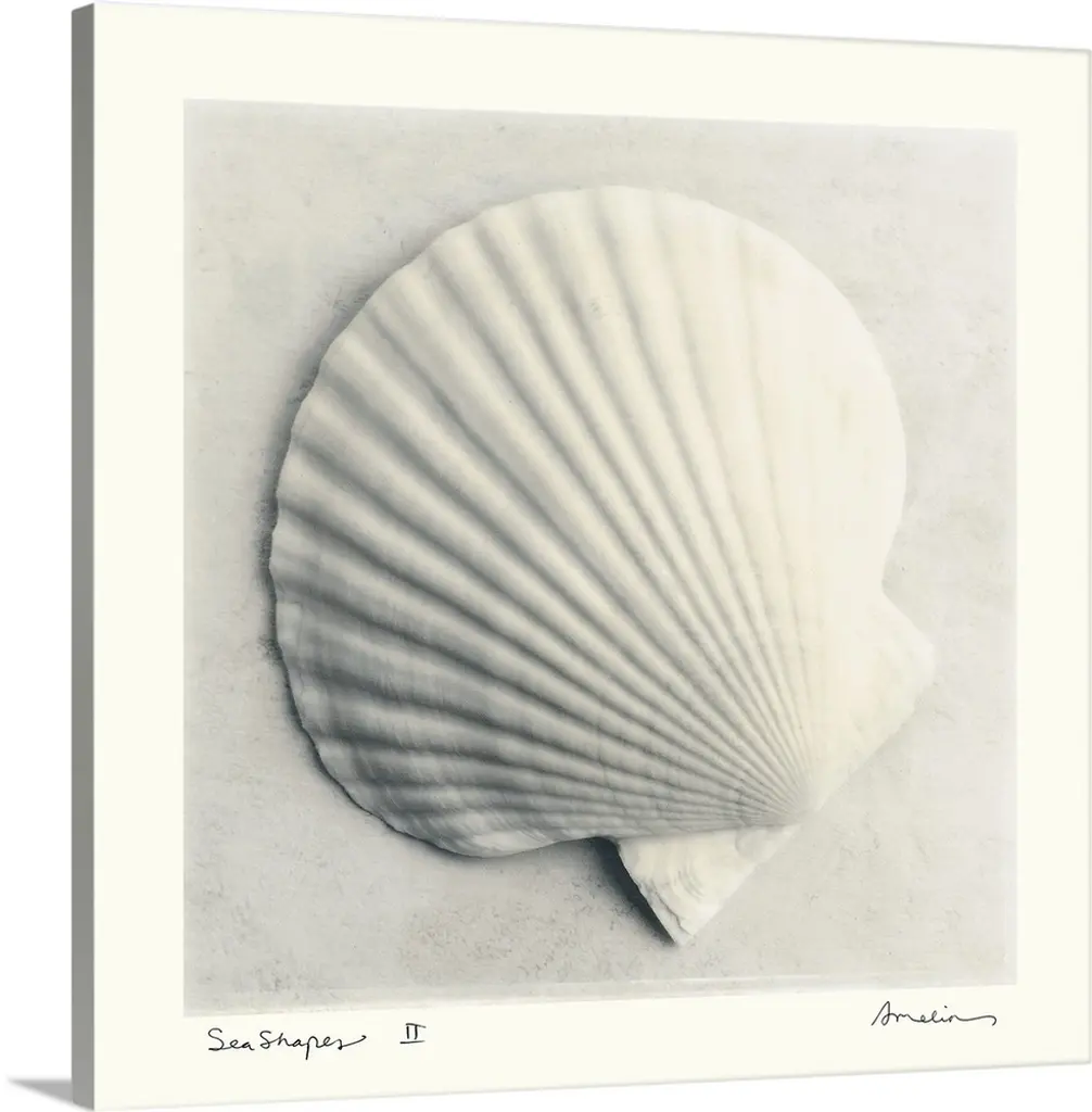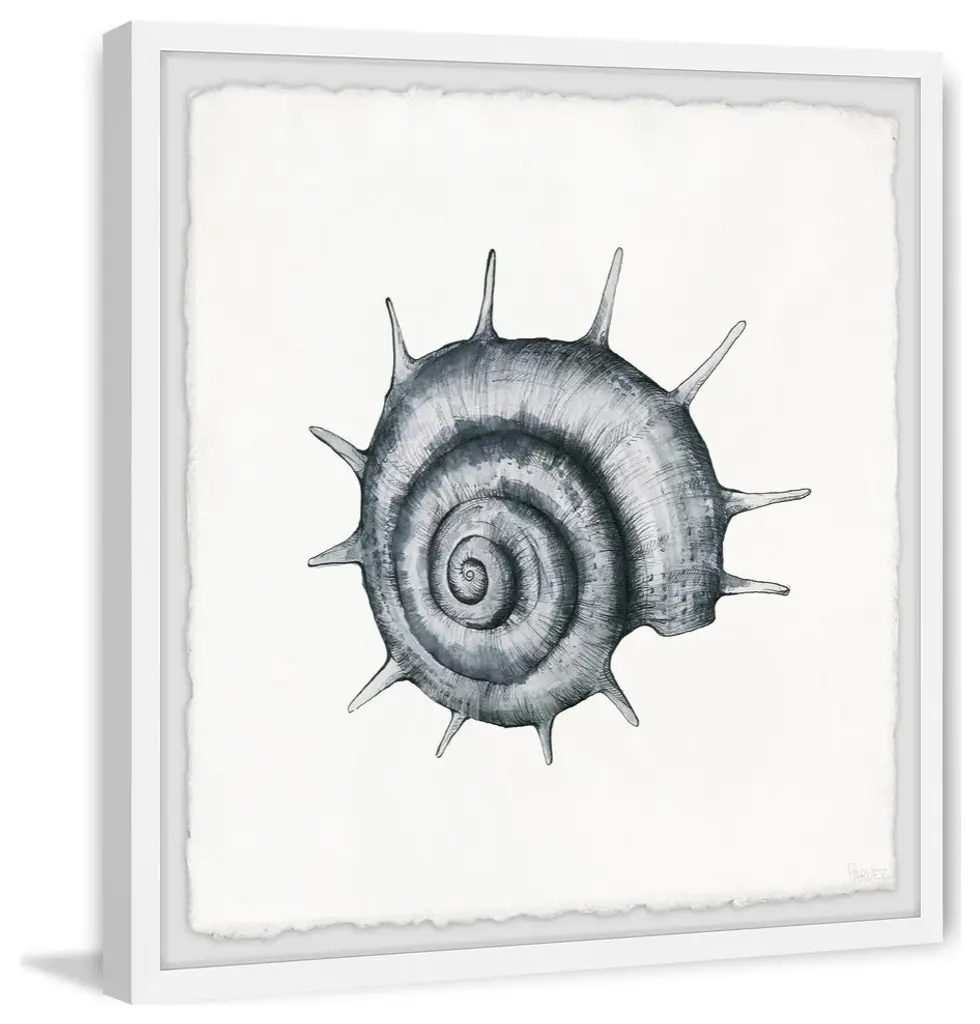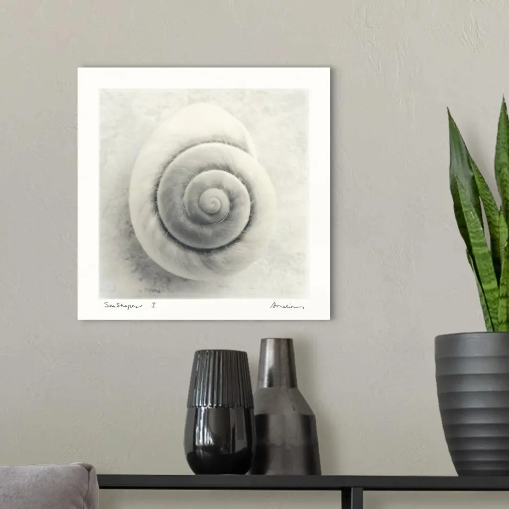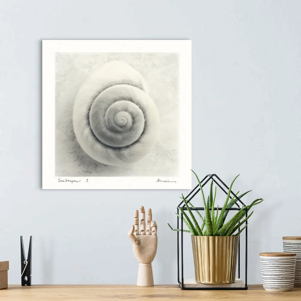 Large, square home art docor of a single, spiral sea shell on the sand, the image surrounded by a solid, light border, the title and photographers signature written below the image.