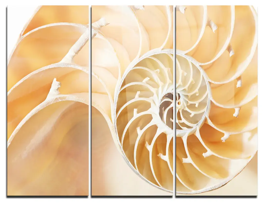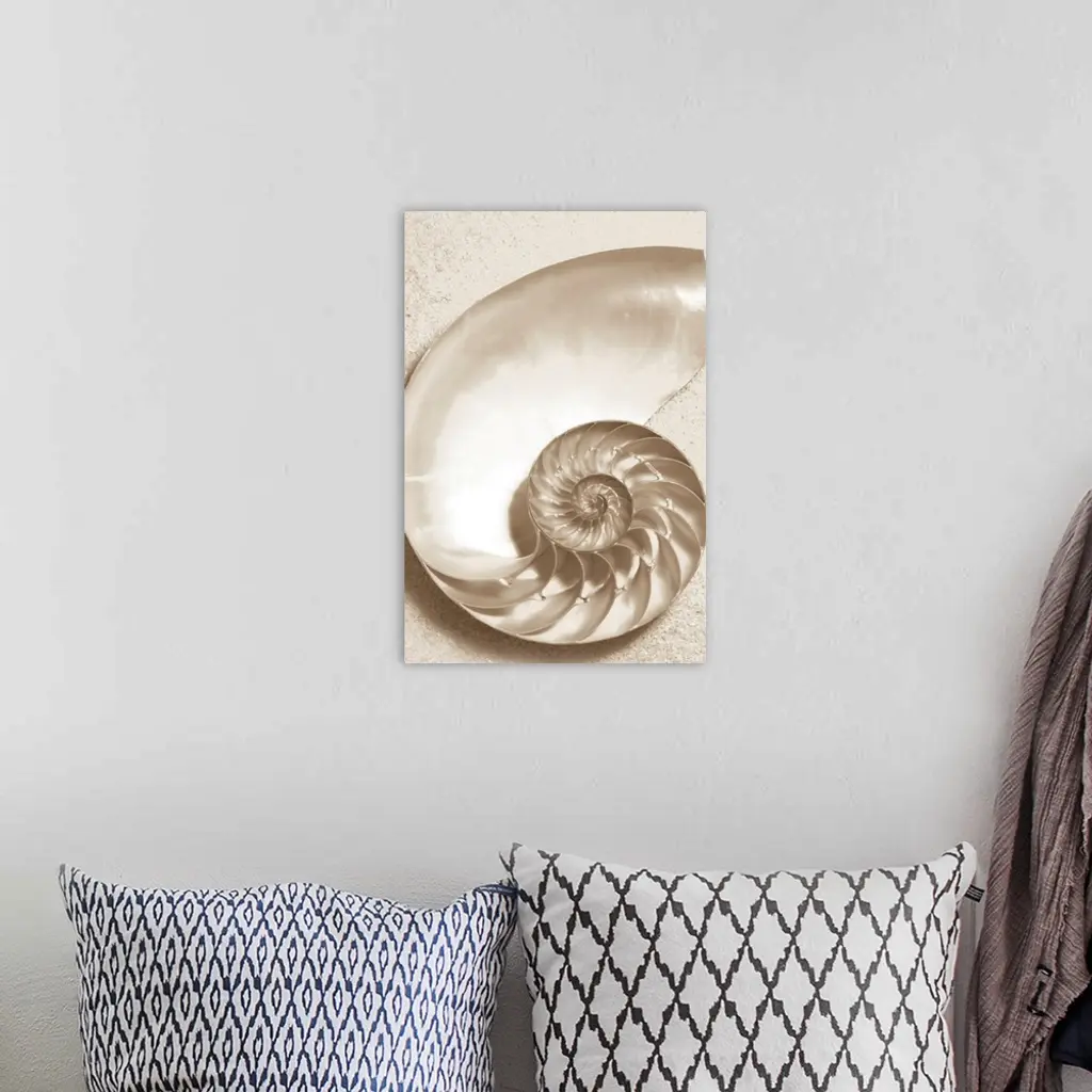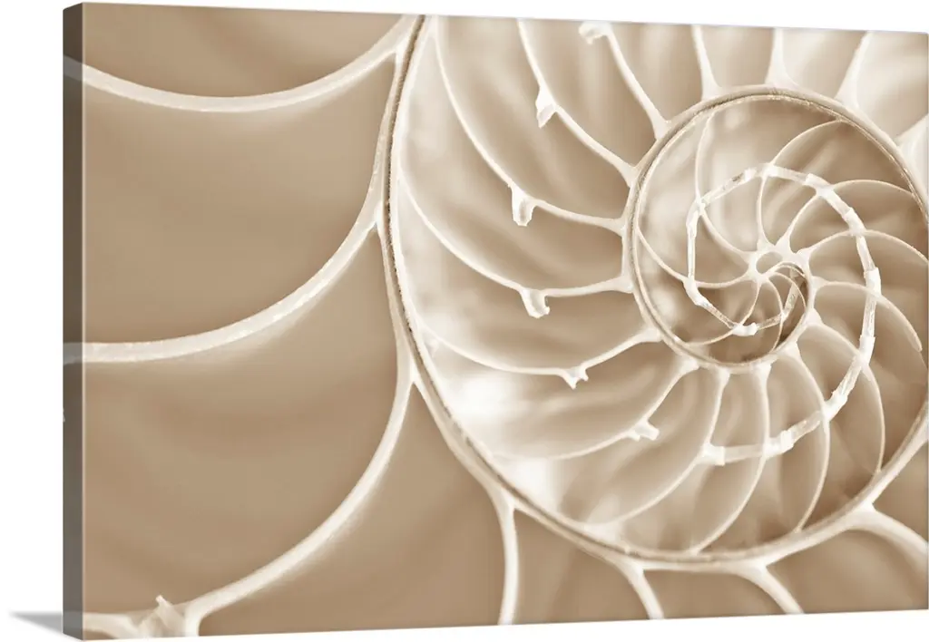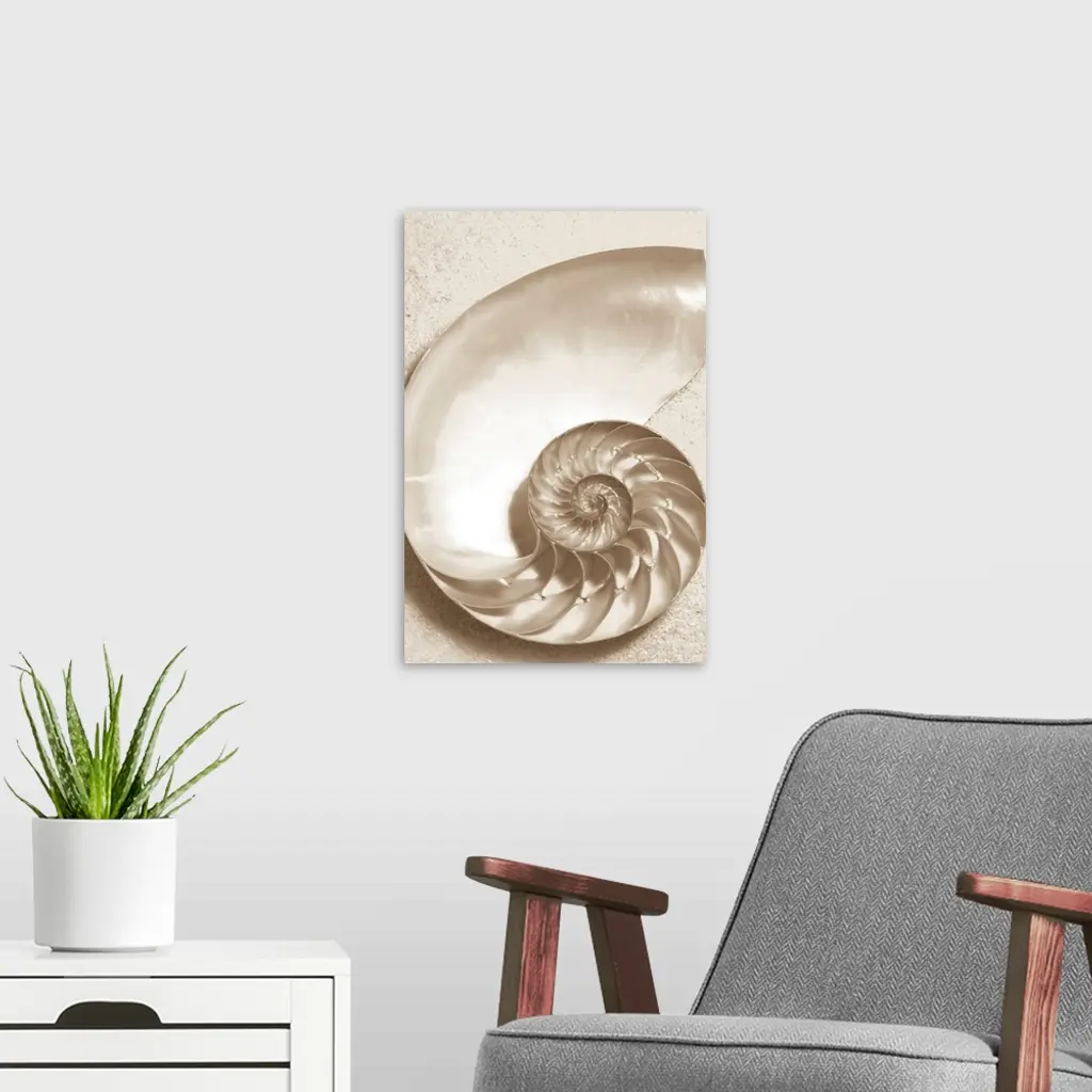 Sepia toned image of the inside of a sea shell with it's twisting compartments and sand.