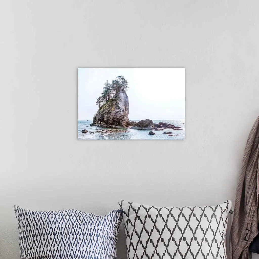 Vertical columns of rock scatter beaches near Olympic National Park, Washington.