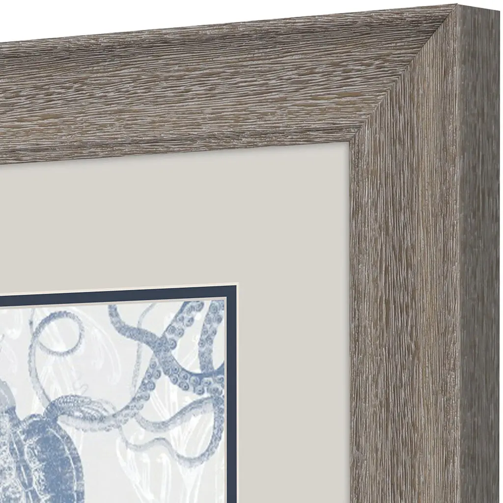 The ocean depths are alive with plant and animal life. Matted in gray and navy blue. Framed in a rustic wood-grain finish moulding.