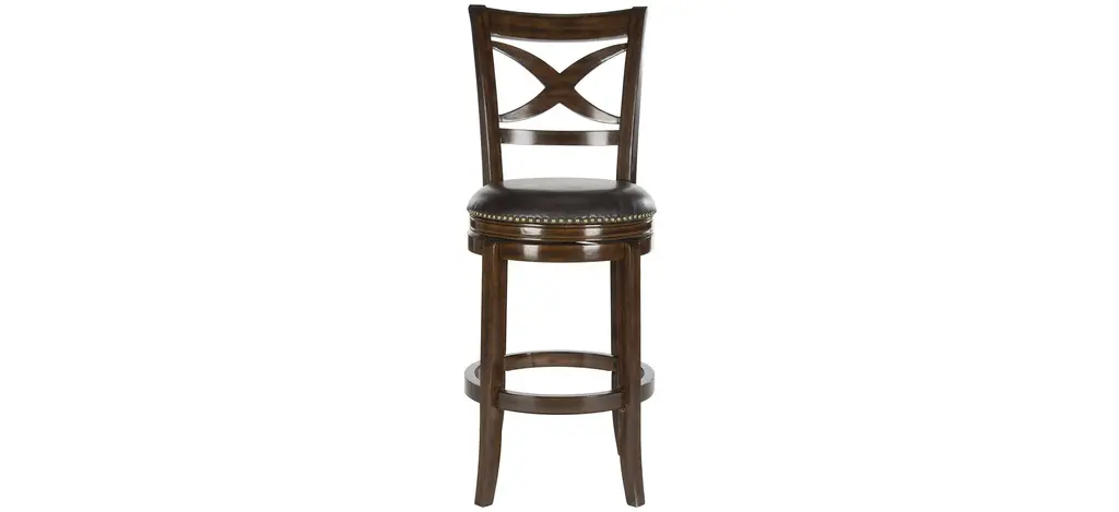 Choose the Seabrook Bar Stool for great styling and performance. A graceful new take on d_cor tradition, it features a carved open back and gently curved legs-all crafted in Malaysian Oak in a dark oak finish. The swivel seat's black bi cast leather cushion with nail head trim provides an elegant look.