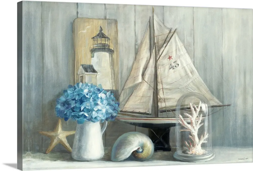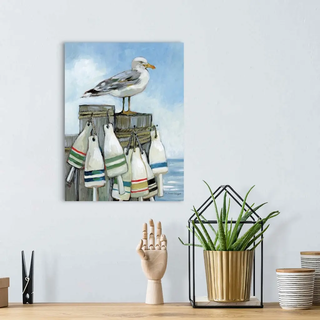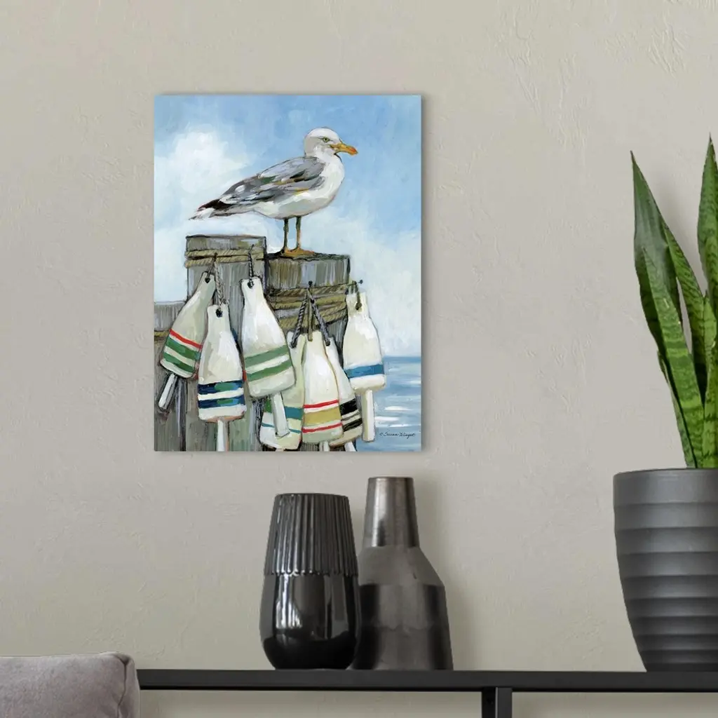 This seagull stands tall on top of the buoy-adorned pier, perfect for coastal and nautical decors.
