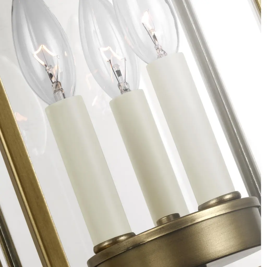 The Sean Lavin Wellsworth three light outdoor post top in painted distressed brass enhances the beauty of your property, makes your home safer and more secure, and increases the number of pleasurable hours you spend outdoors. A subtle interplay of traditional design elements and nautical influences creates the charming visual approach to the Wellsworth outdoor collection. Available in Painted Distressed Brass finish with Clear glass reflects a more contemporary approach. The Wellsworth collection includes a 3-light outdoor pendant, a 3-light outdoor post lantern, and 3-light small and medium outdoor lanterns, as well as a 4-light large outdoor lantern. Cast aluminum construction ensures durability. Wet Rated. Features