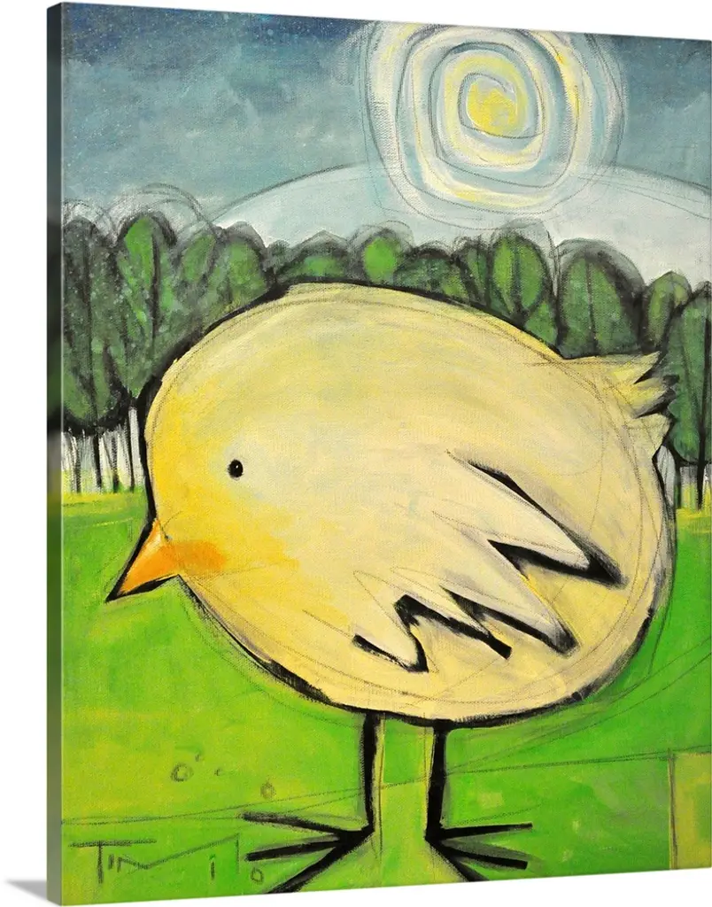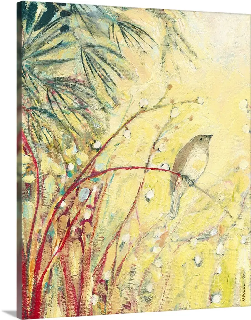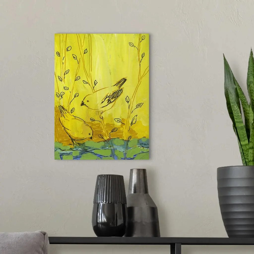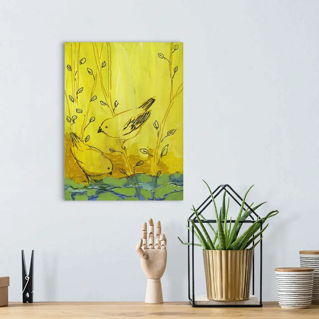 Cute contemporary illustration of two small backyard perching birds exploring leafy twigs in bright, springtime colors.