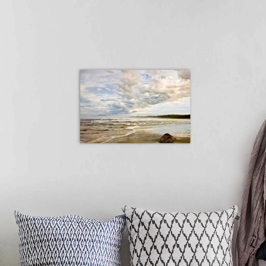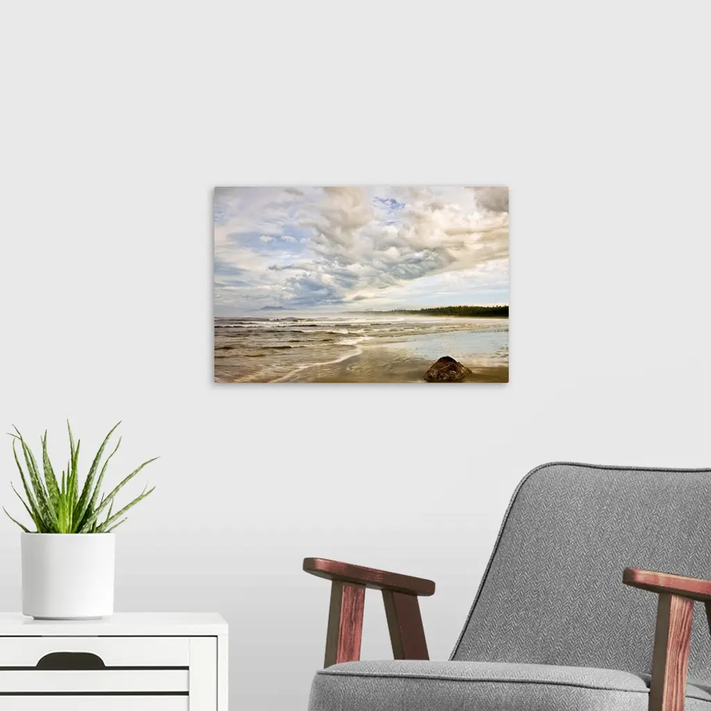 Oversized, horizontal, fine art photograph of the shoreline on a beach, beneath a sky of fluffy cotton clouds, a tree line can be seen on the distant horizon.