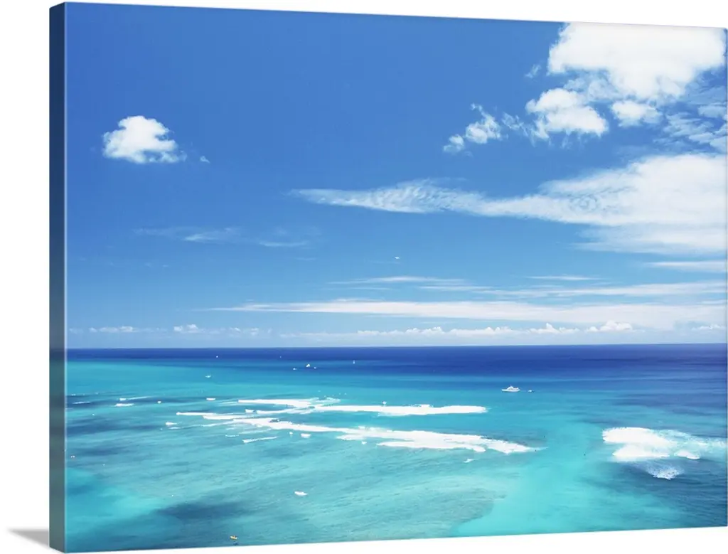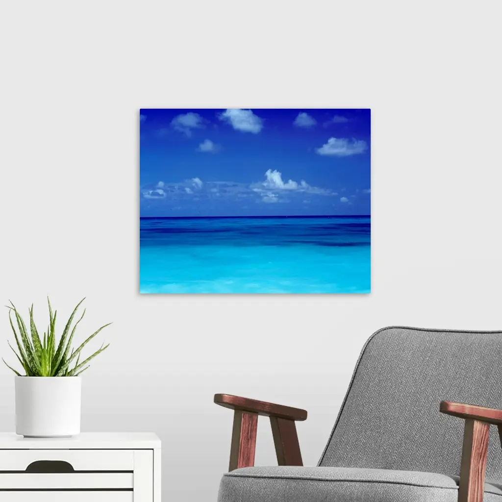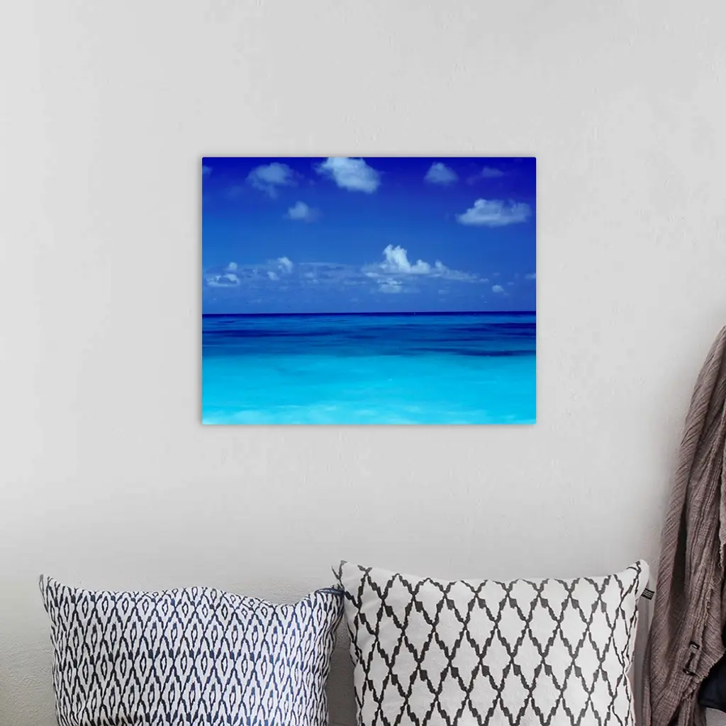 Big square photo art of a clear ocean with puffy clouds in a blue sky.