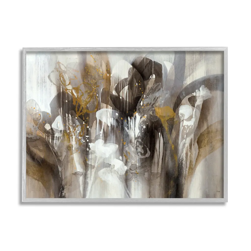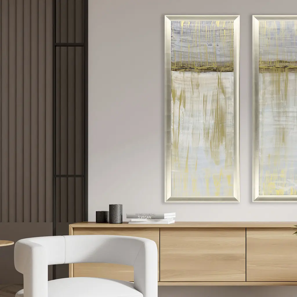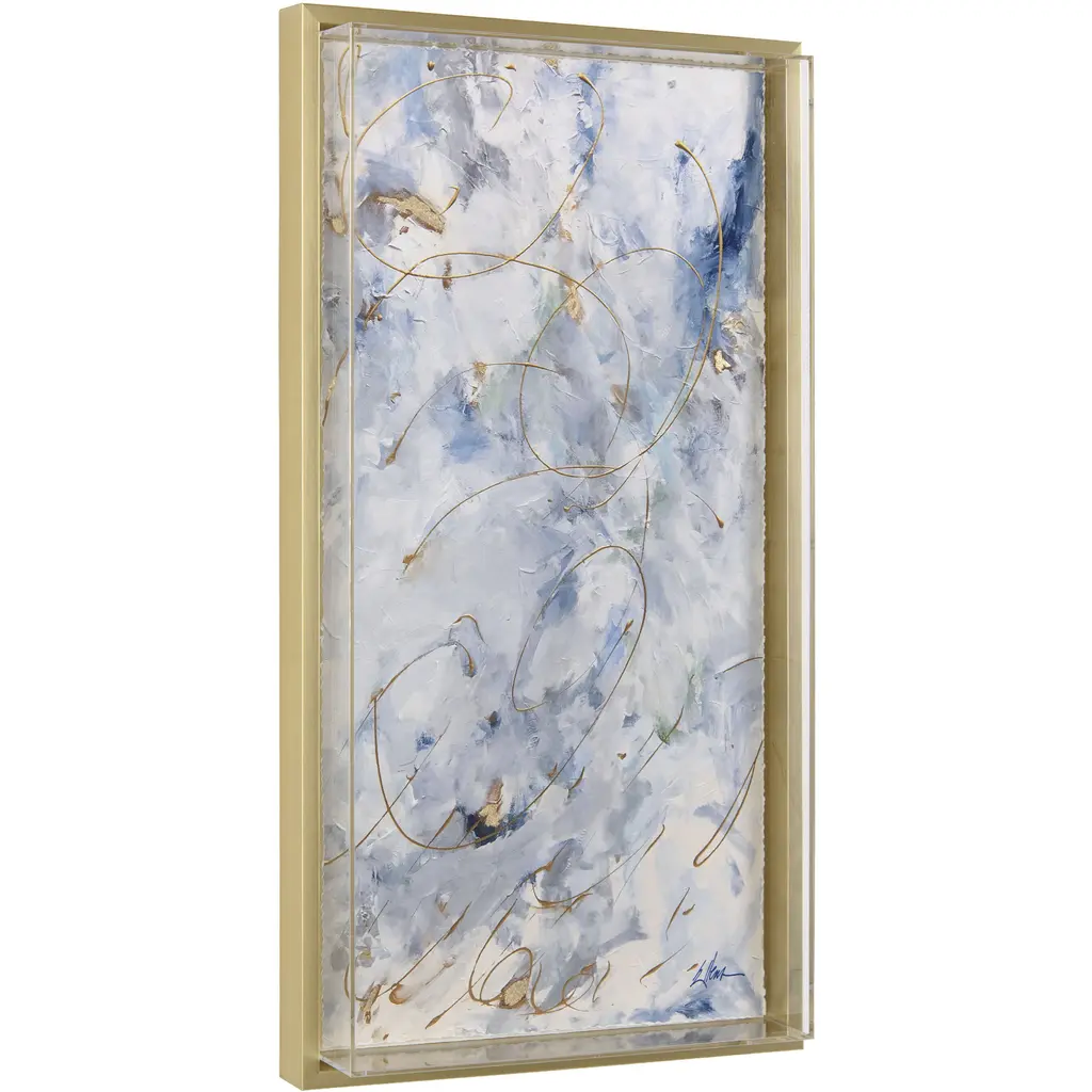 Exclusive reverse hand painted on acrylic. Framed in a silver leaf wood shadow box style moulding.