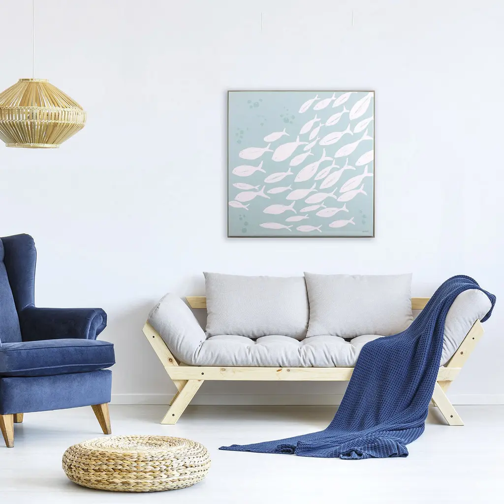 Our school of fish canvas is gallery wrapped over a solid wood stretcher bar and framed in a driftwood tone moulding.