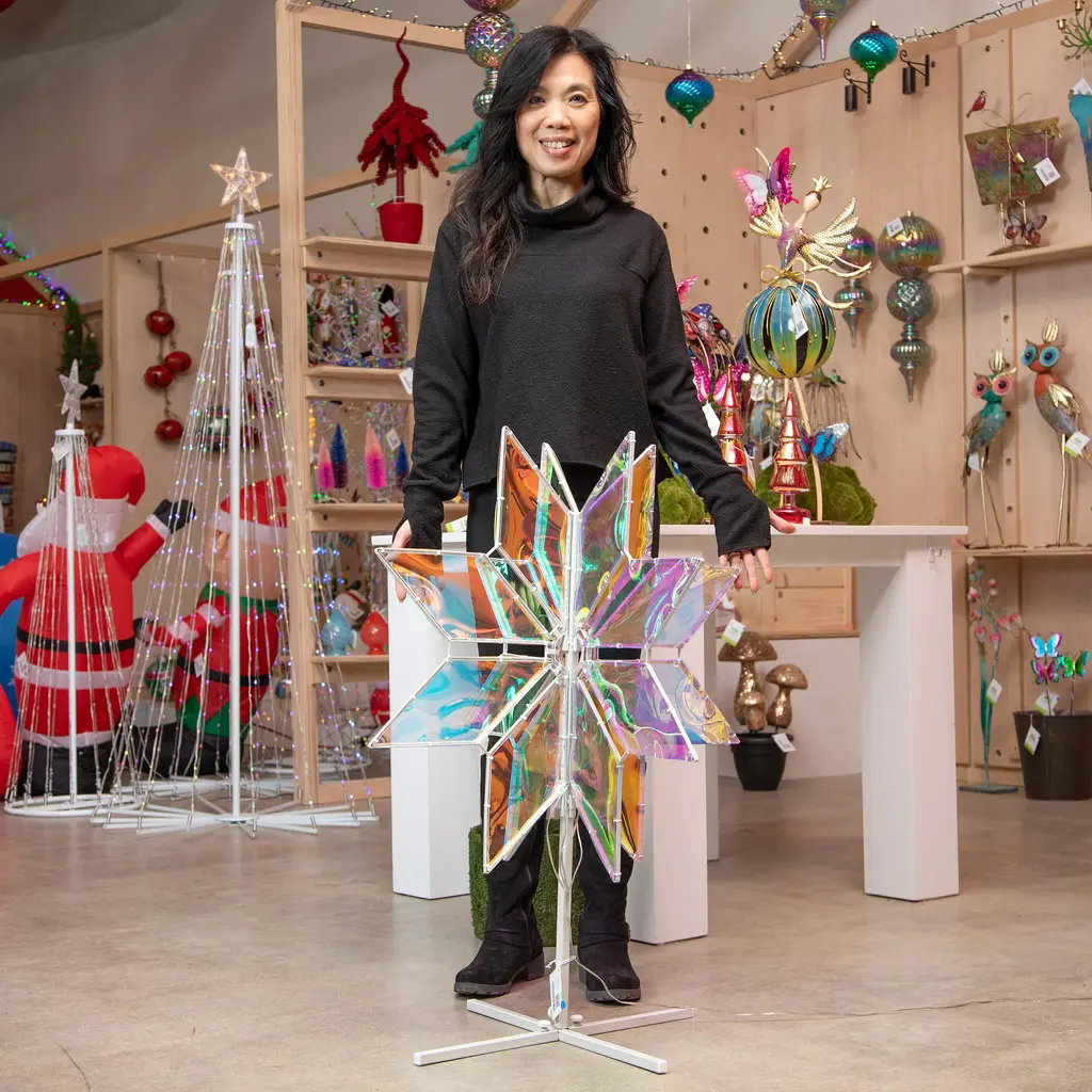 Transform any garden into a captivating outdoor gallery with this statement piece. It features a stunning iridescent snowflake with LED lights. This piece helps merge nature’s natural beauty with art to create a timeless and enchanting space. It’s made from durable materials, so it’s outdoor, plug in safe and weather resistant. It makes a great gift for anyone who loves to spend time outside and wants to create a beautiful oasis.