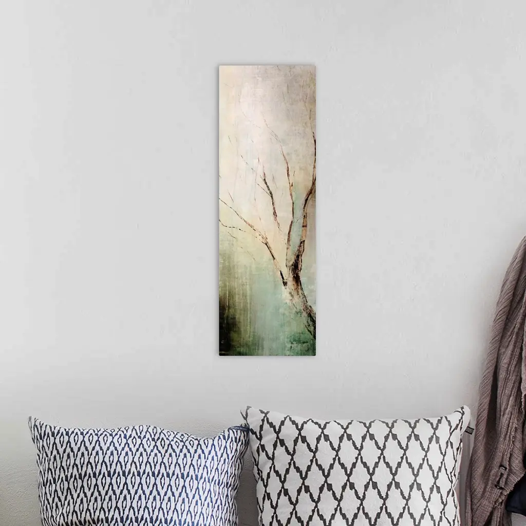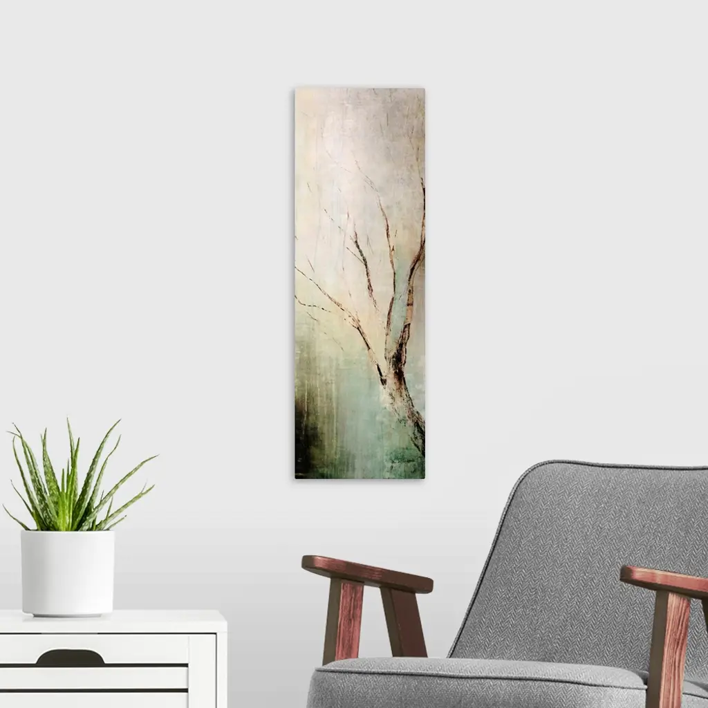 Panoramic contemporary art depicts a lone tree branch composed of earth tones as it sits in front of a bare background.
