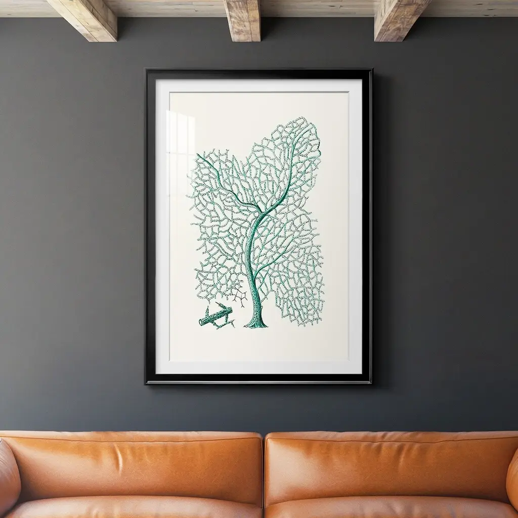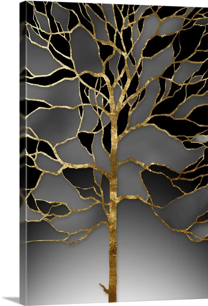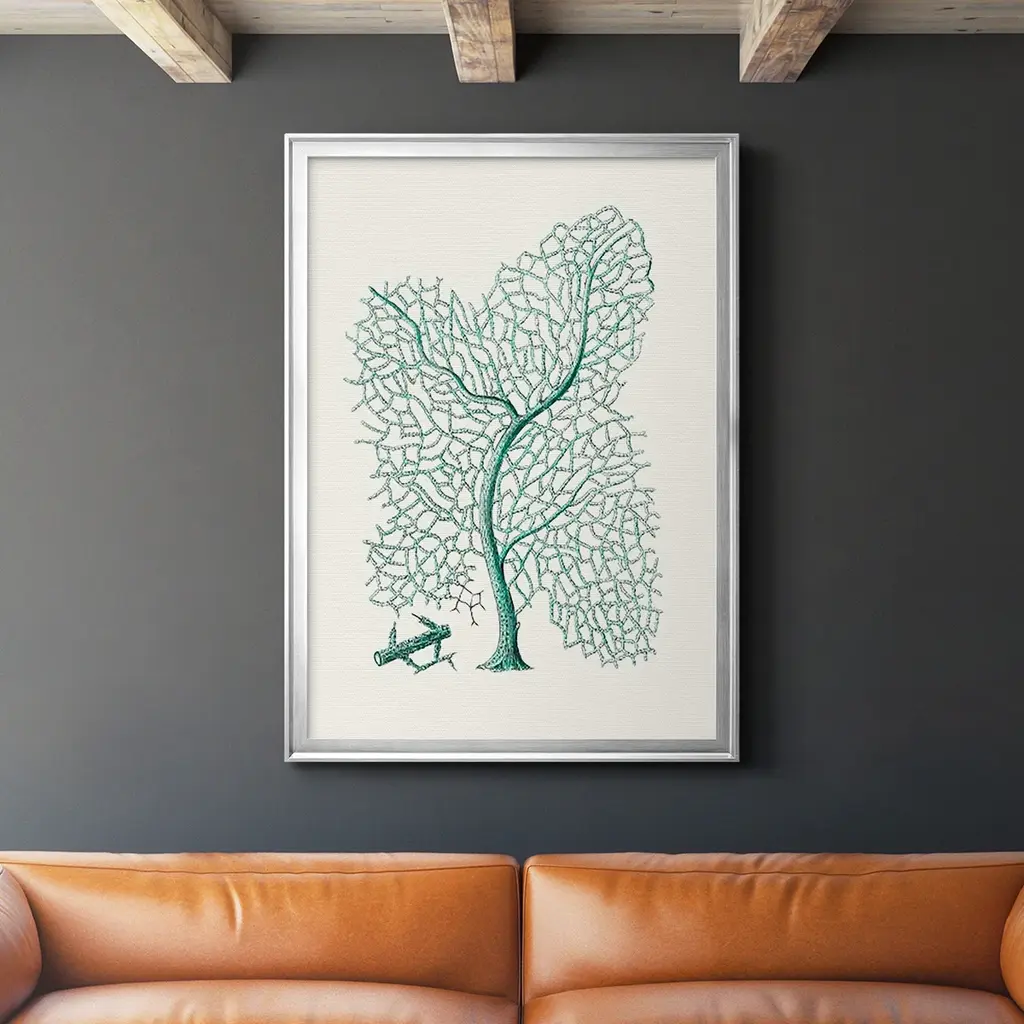 Seasons depicts an elegant tree with exposed roots on acrylic, showcasing silver leaf embellishments. This natural motif displayed from a smooth black gallery frame, lifted from the background, allowing the tree to cast a visible shadow.