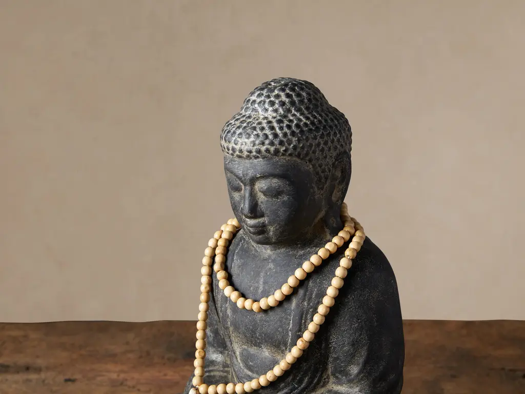 Crafted by Indian artisans, this Buddha is seated in calm contemplation. Cast stone features a natural finish complemented by a strand of prayer beads with a tassel. Made by Indian artisans from cast stone. Features a natural finish.