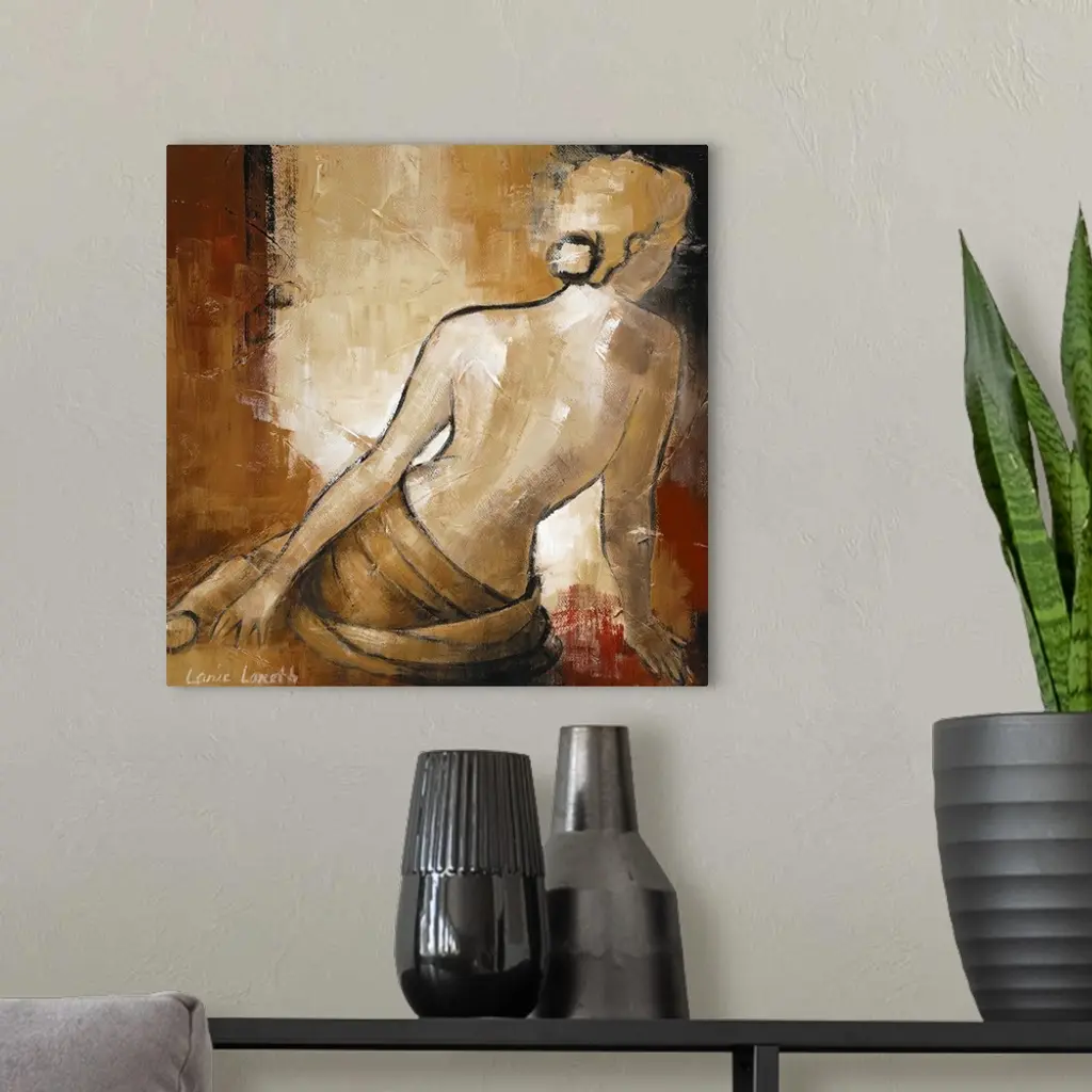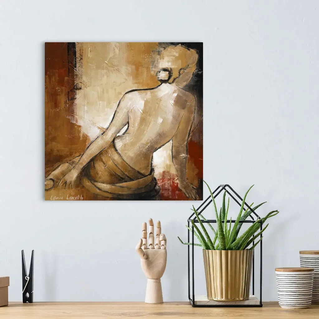 Square, contemporary art on large canvas of the back of a topless woman sitting on the floor. Painted with thick, heavy brush strokes in golden and warm colors.