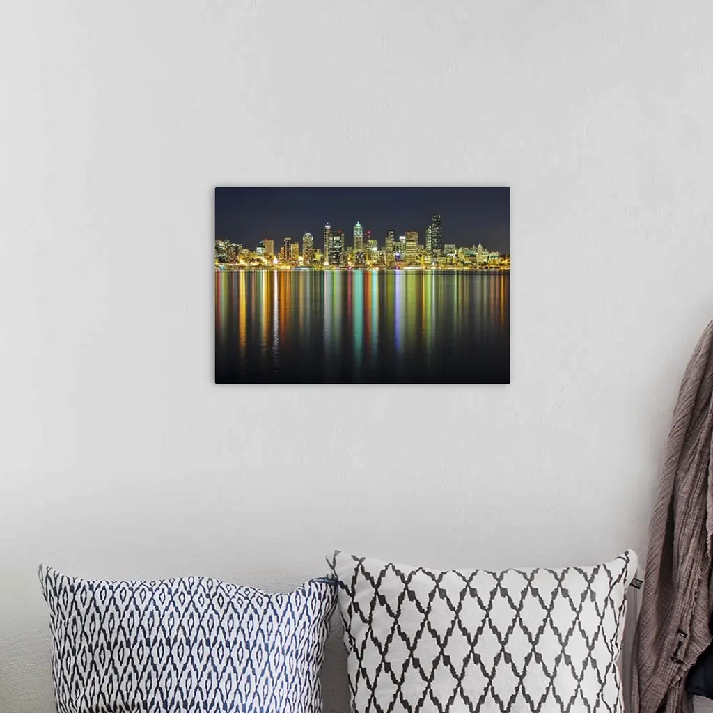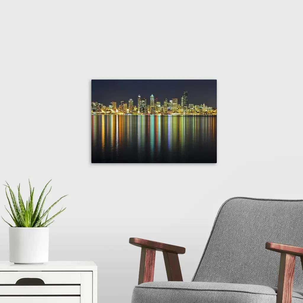 Large photograph taken of the Seattle skyline at night with the buildings lit up and reflecting in the water below.