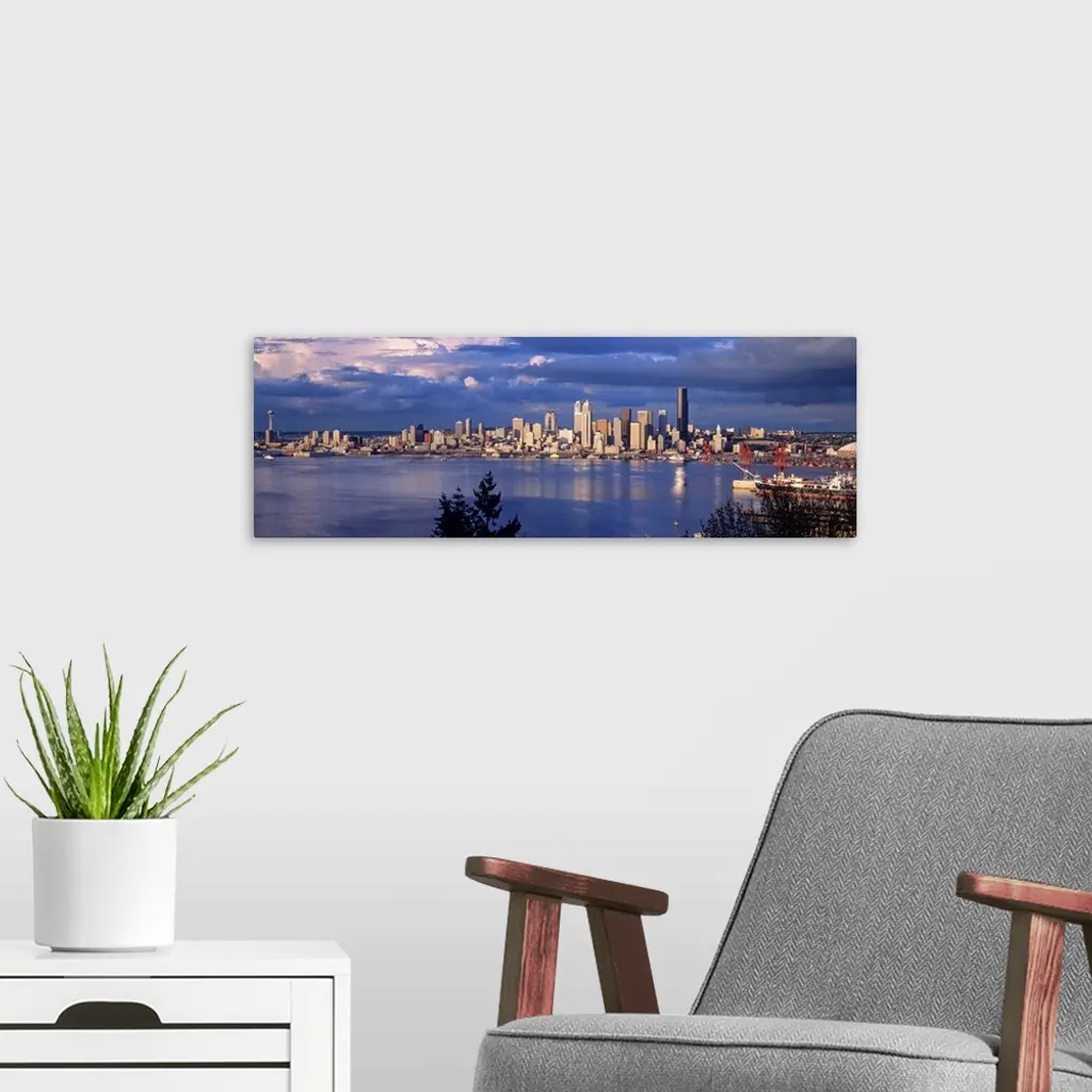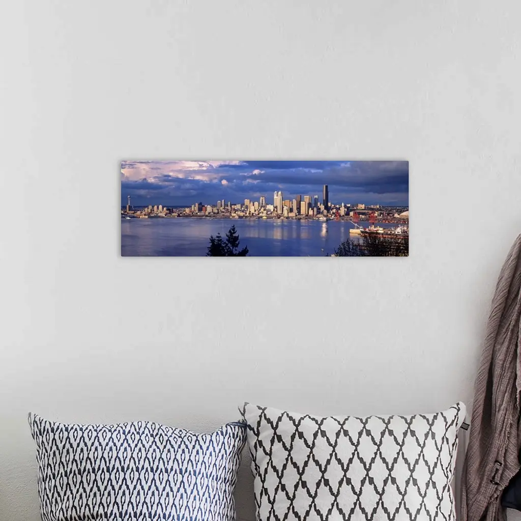 Panoramic, distant photograph over the water of the Seattle skyline, beneath a sky full of large, billowing clouds. Tree tops can be seen in the foreground.