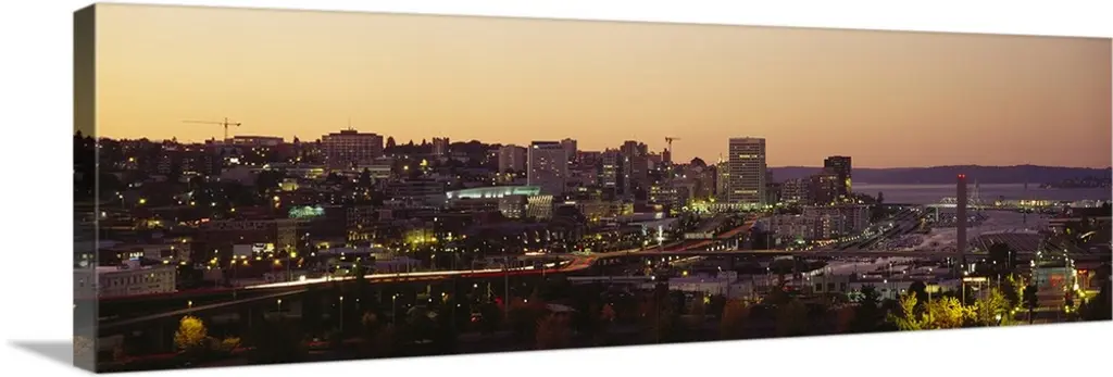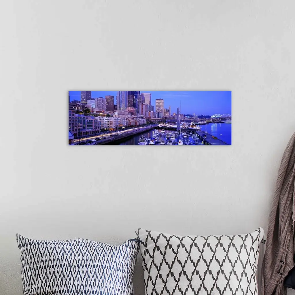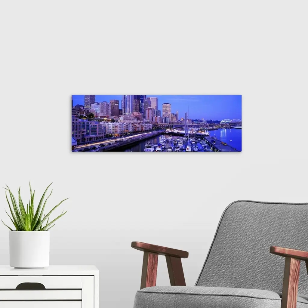 Landscape photograph along the coast of the Seattle skyline at dusk, with many boats docked in the water and lit skyscrapers in the background against a blue sky.