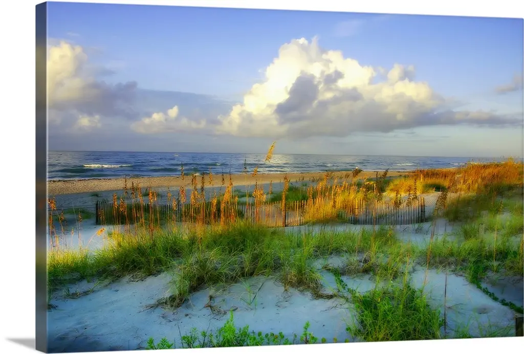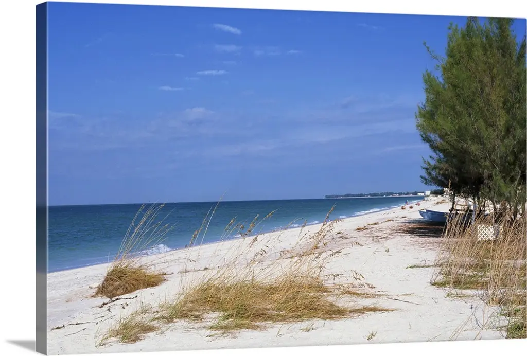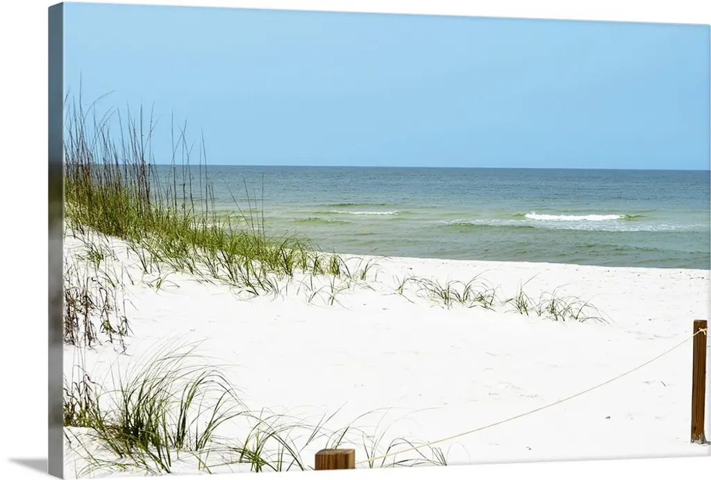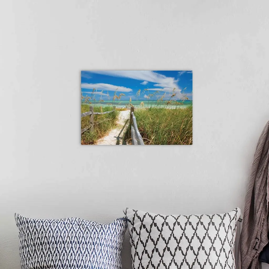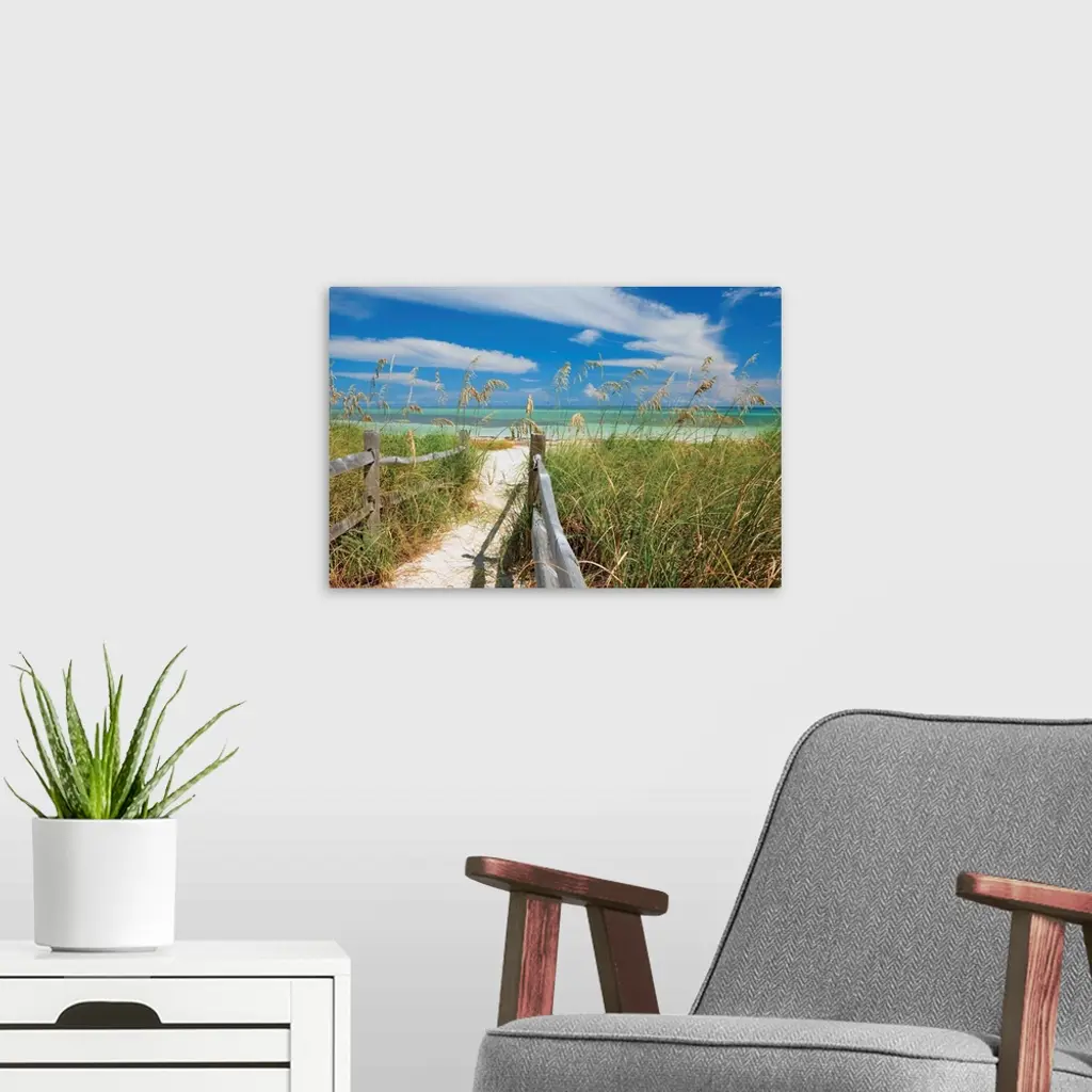 Photograph of a sandy path lined with a wooden fence and beach grass leading to a sandy beach with clear, teal waters and a blue sky.