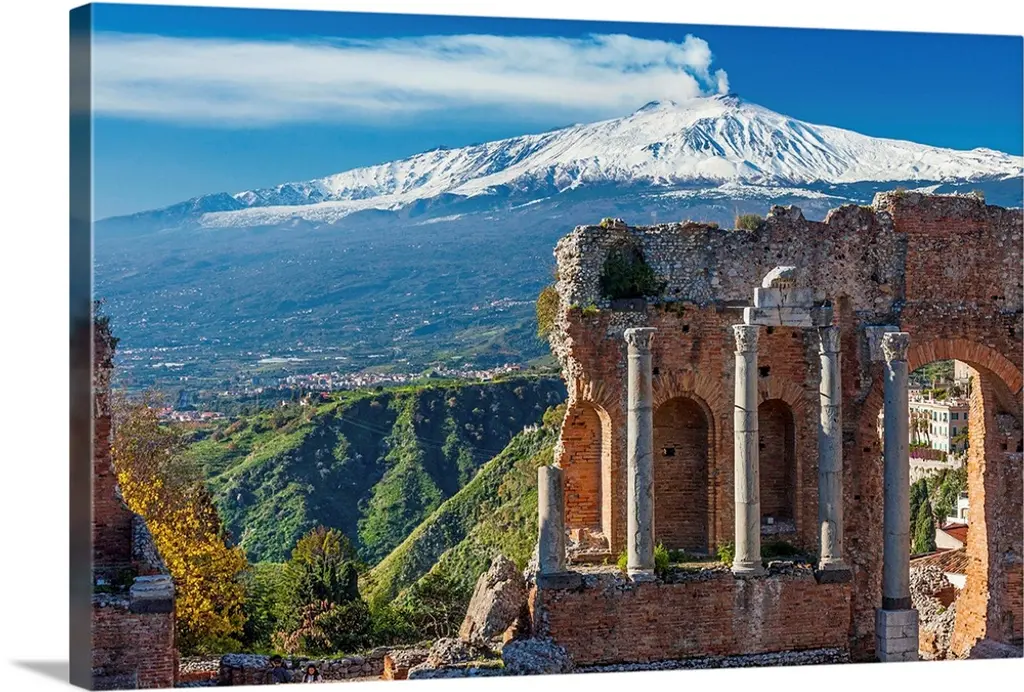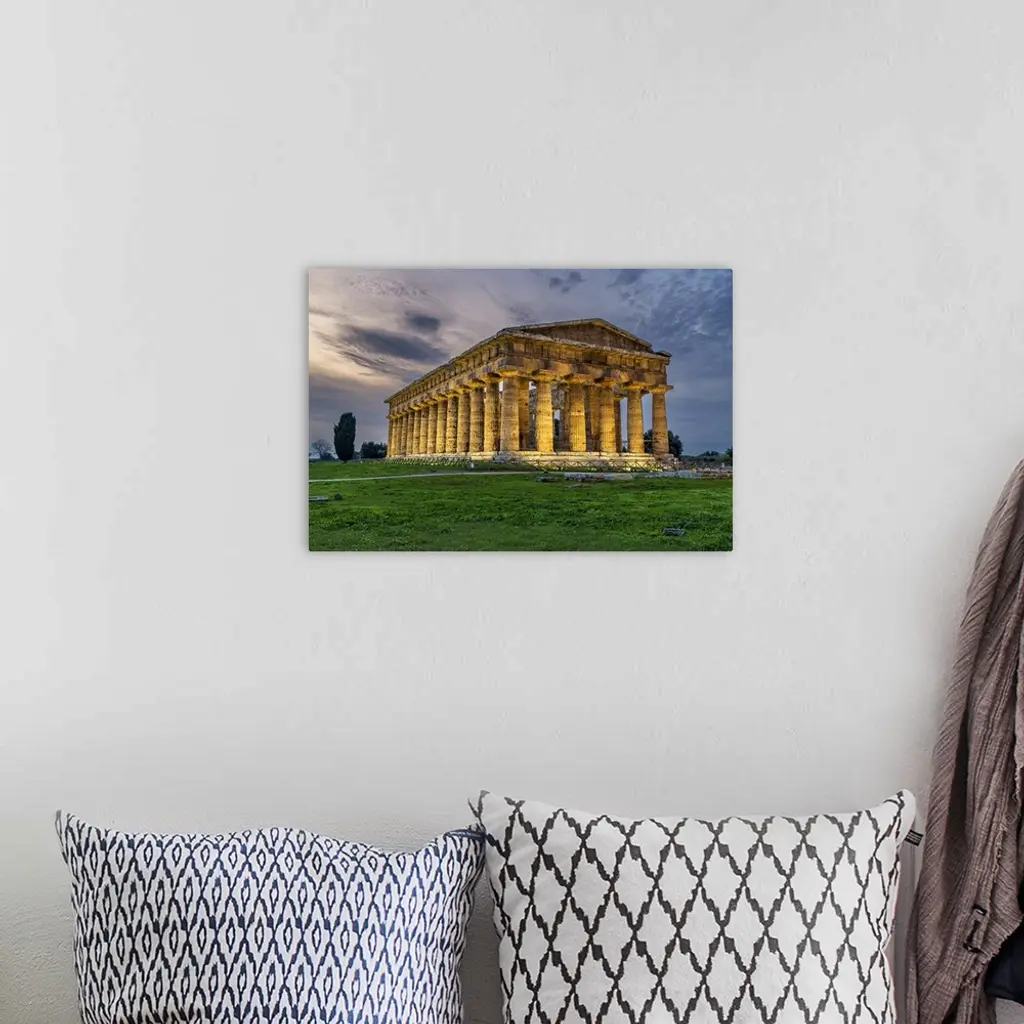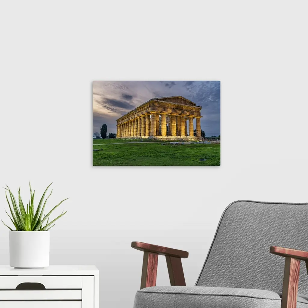 Second Temple Of Hera (Temple Of Neptune) Lit Up At Dusk , Paestum, Campania, Italy wall art for home and office decor. Discover canvas art prints, photos, mural, big canvas art and framed wall art in GreatBigCanvas.com's varied collections.