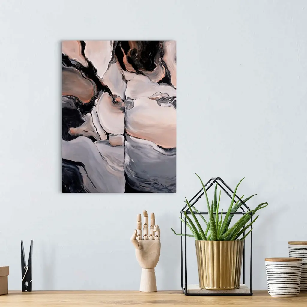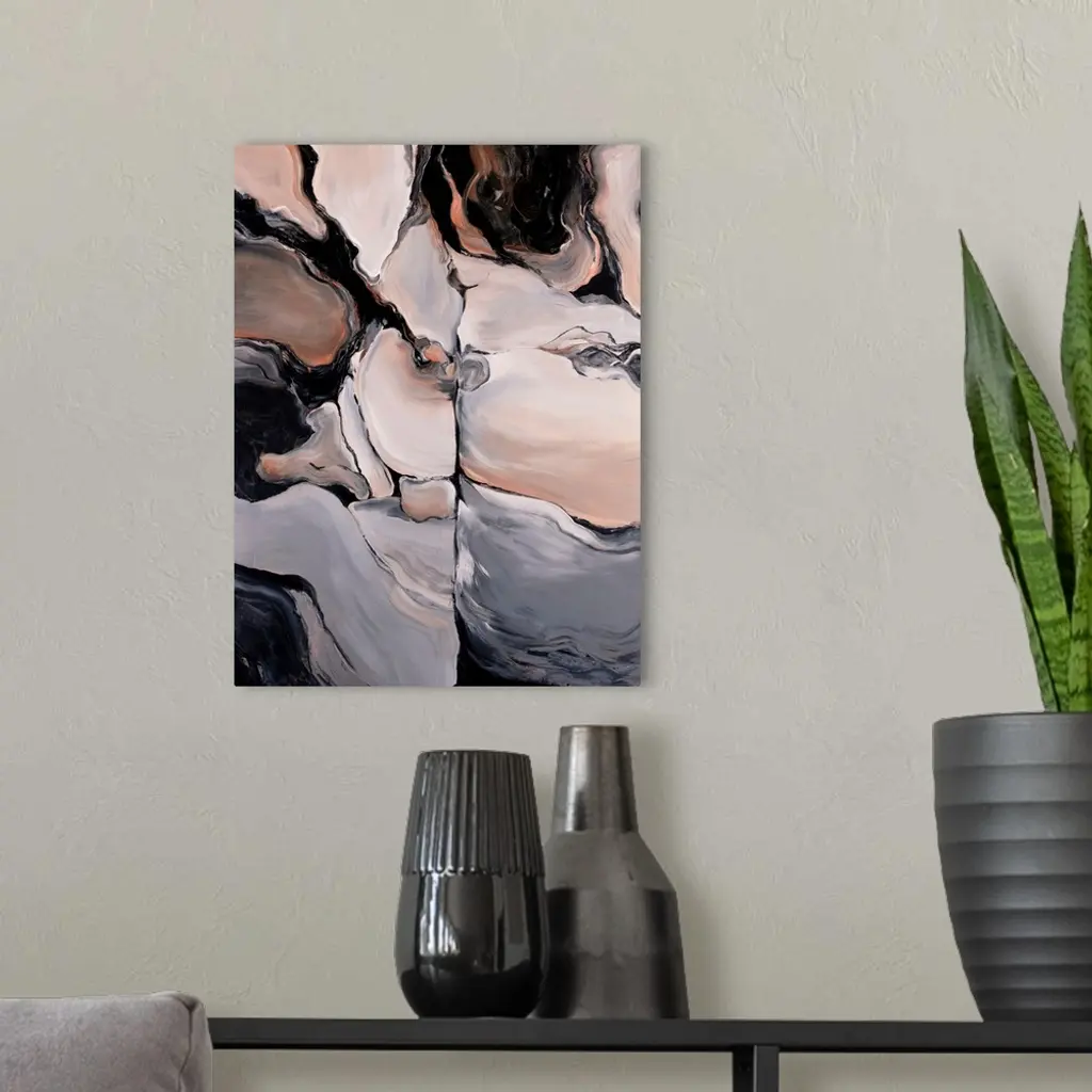 Large abstract art incorporates a mixture of dark and earth tones forming large and small jagged patches positioned next to each other.