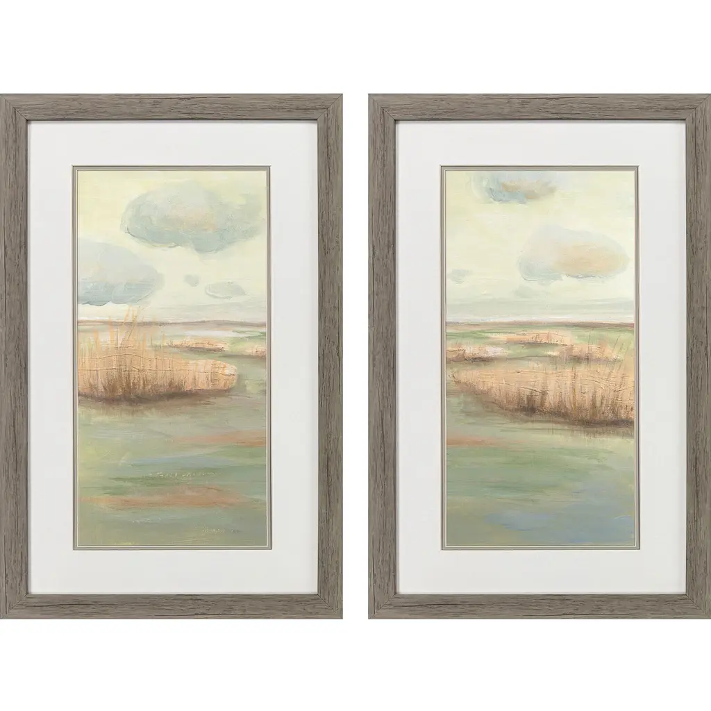 Stunning desert vistas are magical in brightly hued colors. Matted in putty and framed in a sloped profile molding in a champagne gold finish.