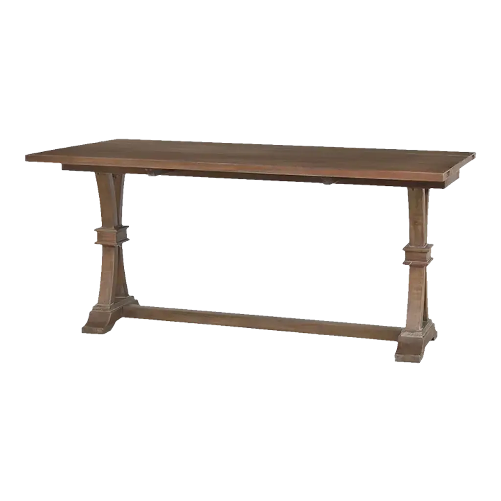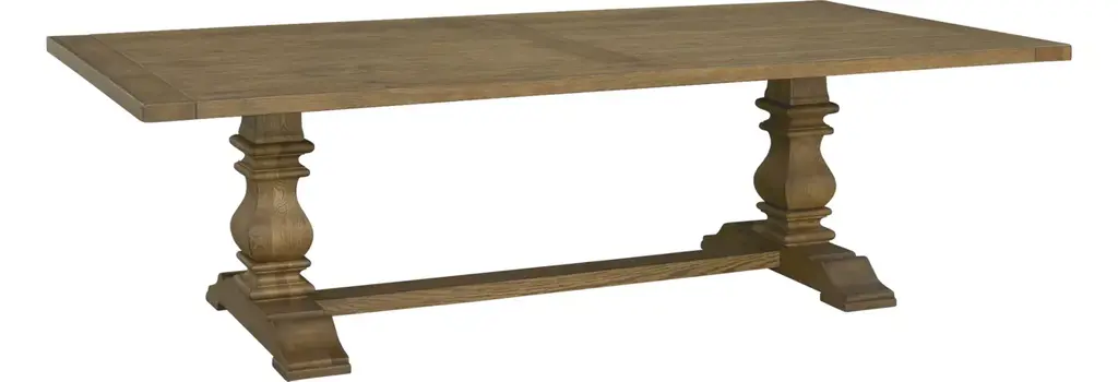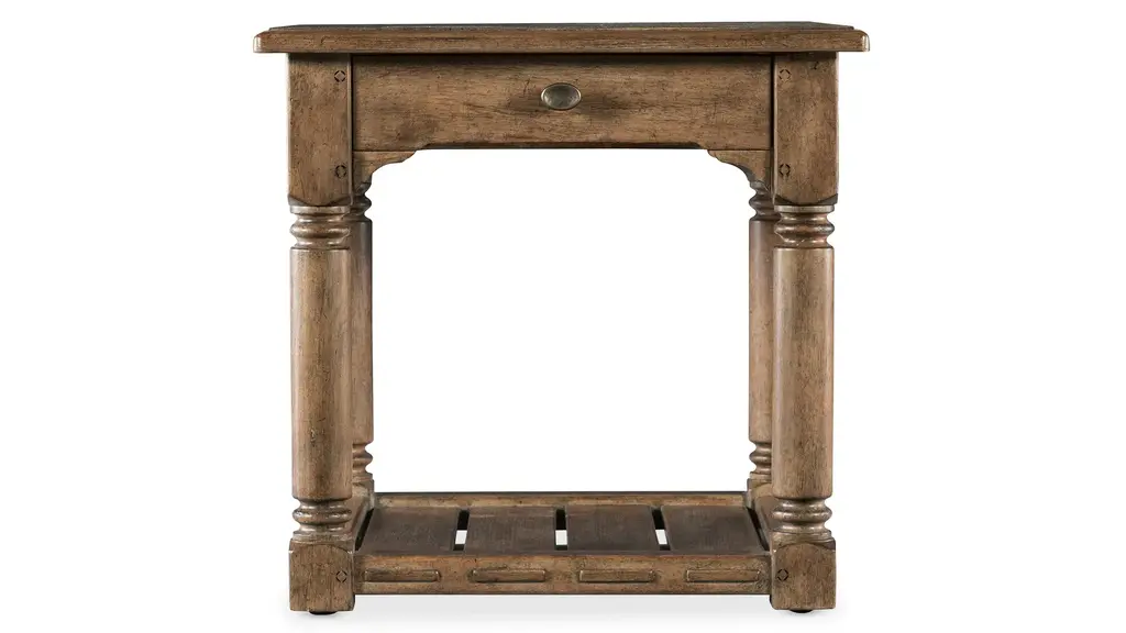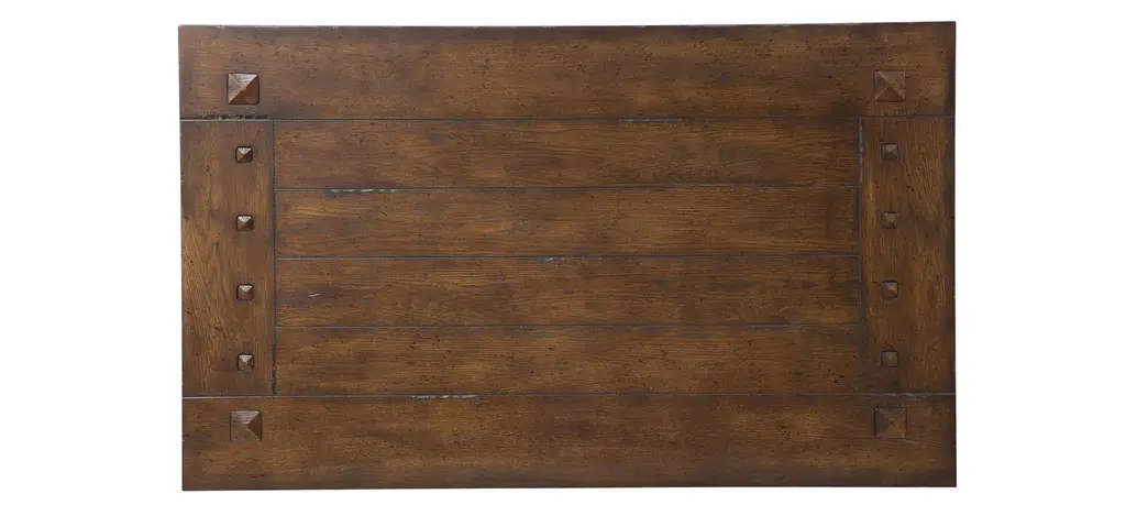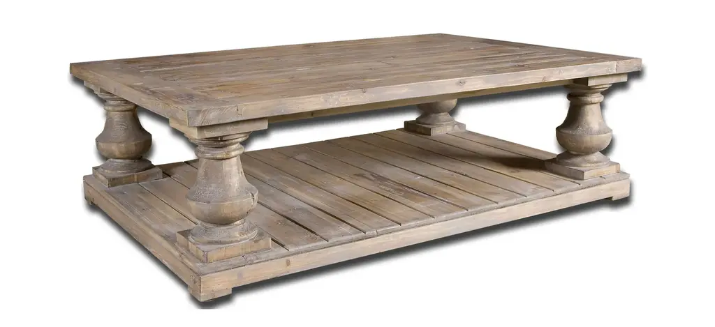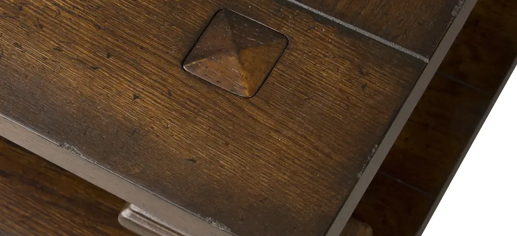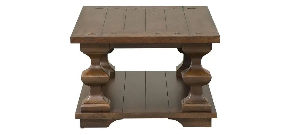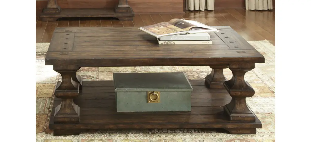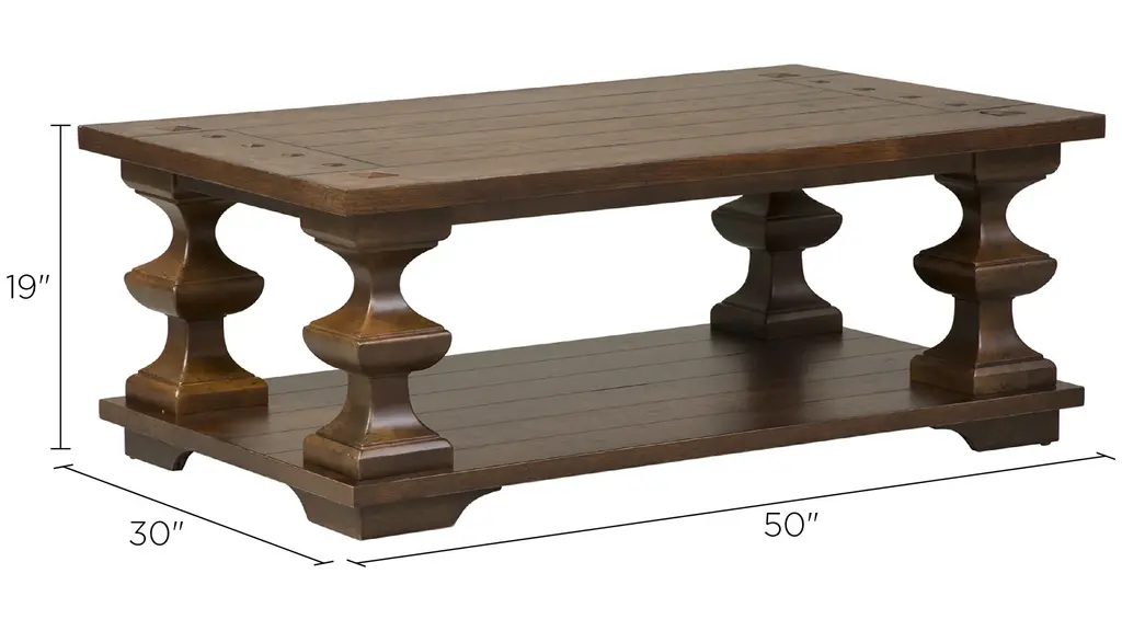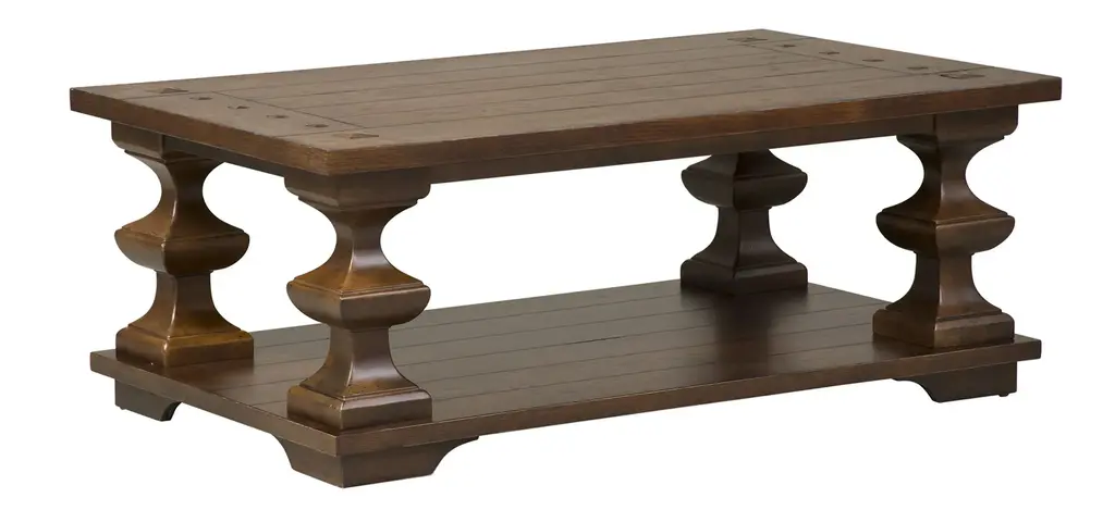 The Sedona cocktail table features Spanish style turned legs with a heavy planked top and square peg accents. Bottom shelves for storage and display are featured on the table. This piece is perfect for leather upholstery.
