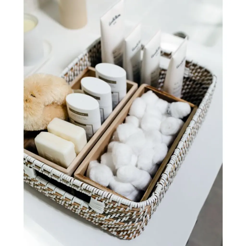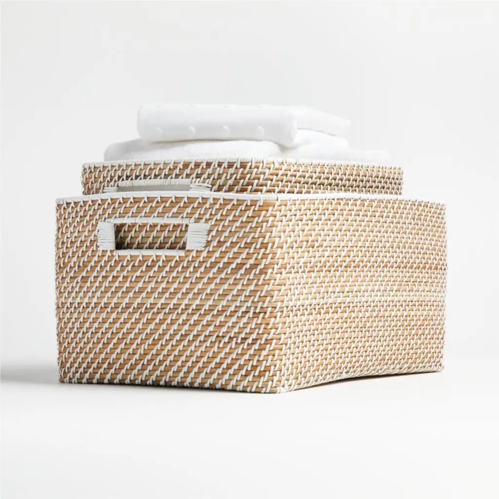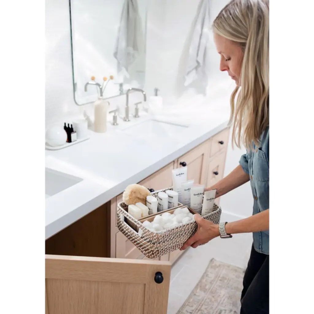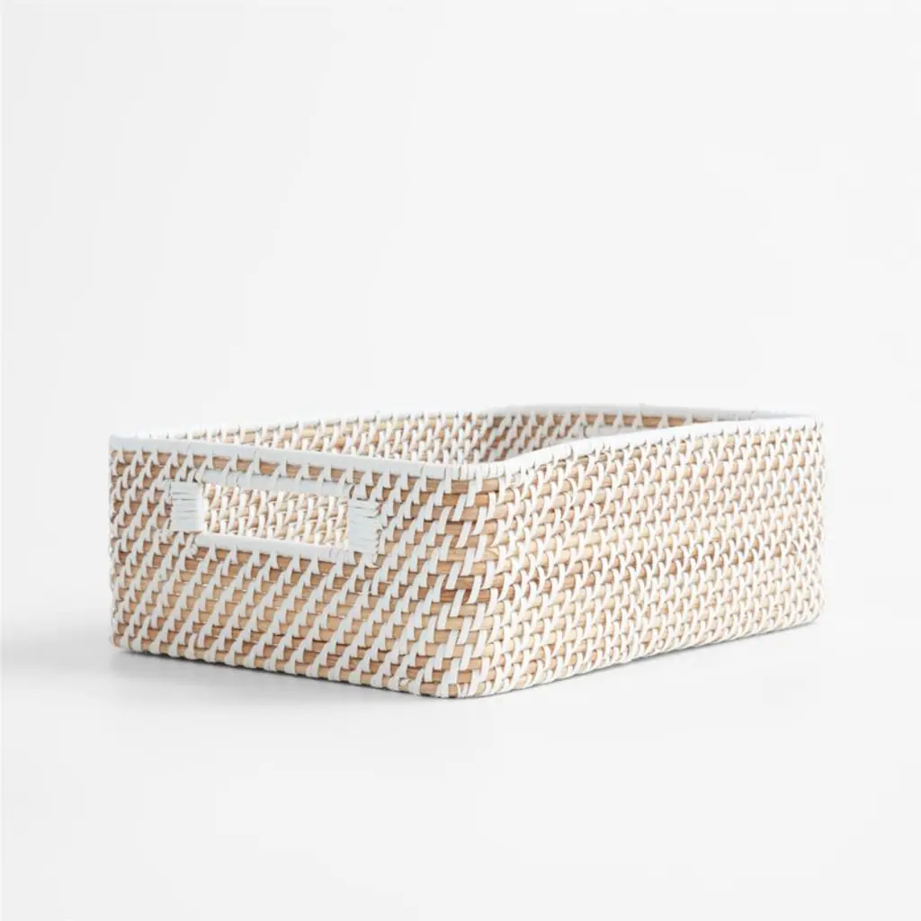 Bringing together the modern and the traditional, a community of weavers combine warmly hued rattan and bright white strands to create our clean-lined Sedona low open tote. The mix of colors and materials gives a fresh feel to the sturdy open shape, constructed with rounded corners and cutout bin handles finished with wrap detail. Ideal for storing washcloths, toiletries for guests or extra rolls of toilet paper, our white low tote is part of our exclusive Sedona storage collection. Each handmade piece will vary slightly in size.Check out our storage ideas for your bathroom.