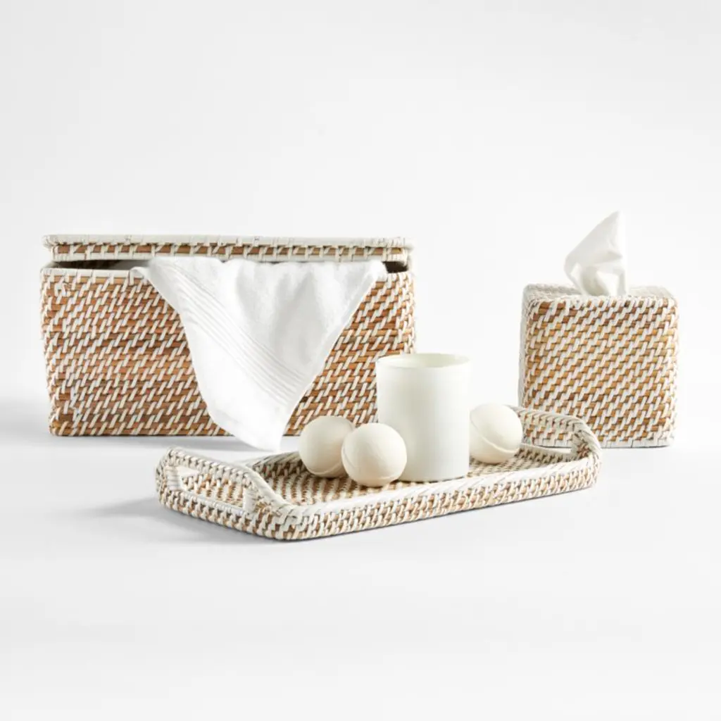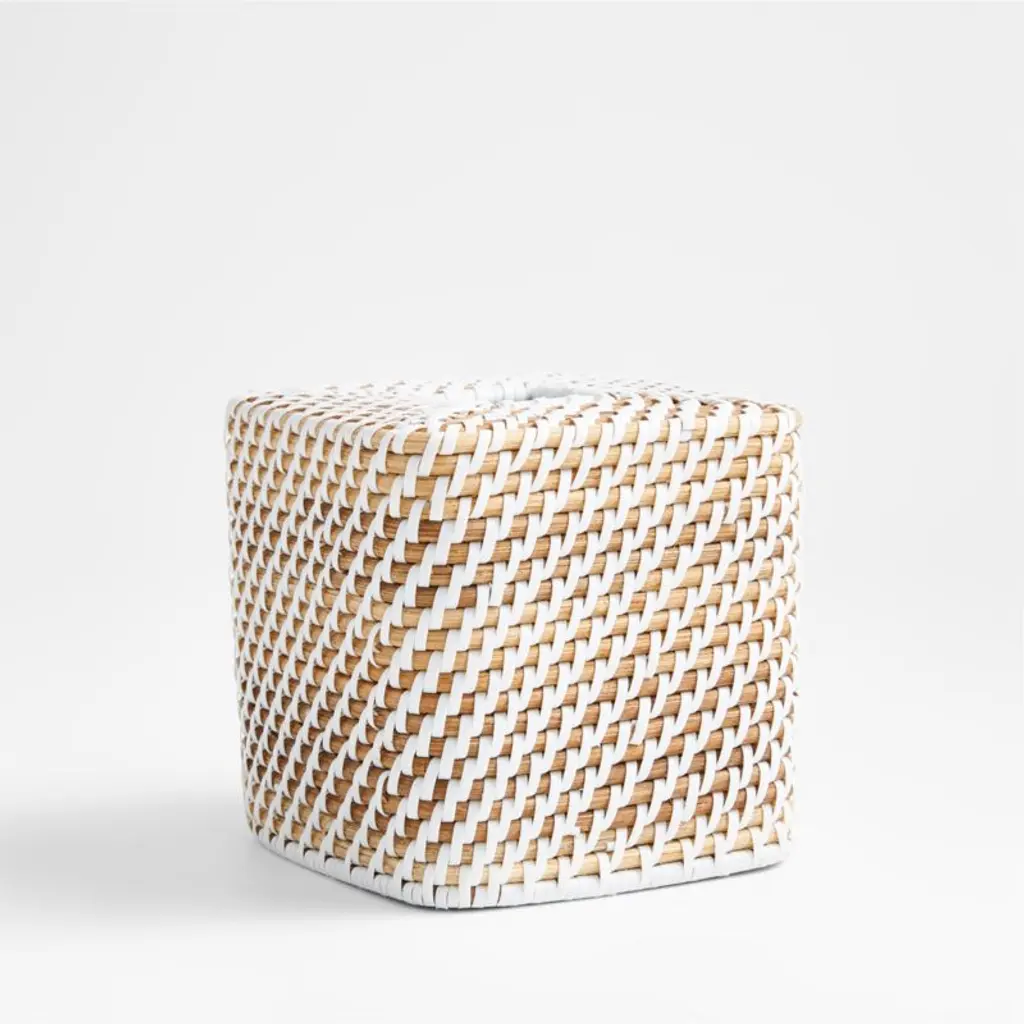 Bringing together the modern and the traditional, a community of weavers combine warmly hued rattan and bright white strands to create our clean-lined Sedona tissue box cover. The mix of colors, textures and materials gives a fresh feel to the rounded square that conceals and dispenses the bathroom essential. Our white square tissue box cover is part of our exclusive Sedona storage collection. Due to its handcrafted nature, each one will be slightly unique.