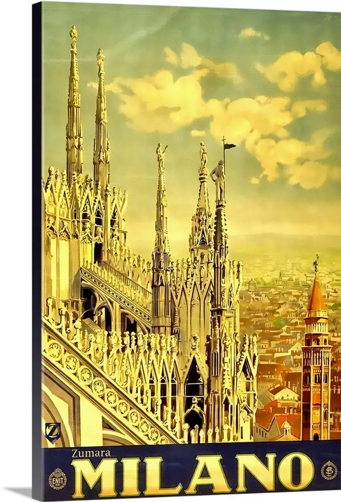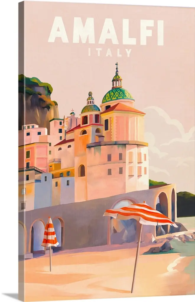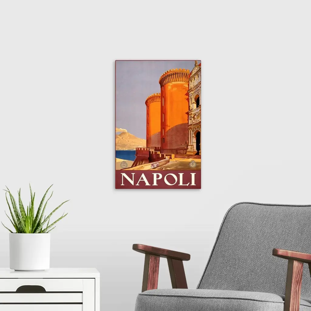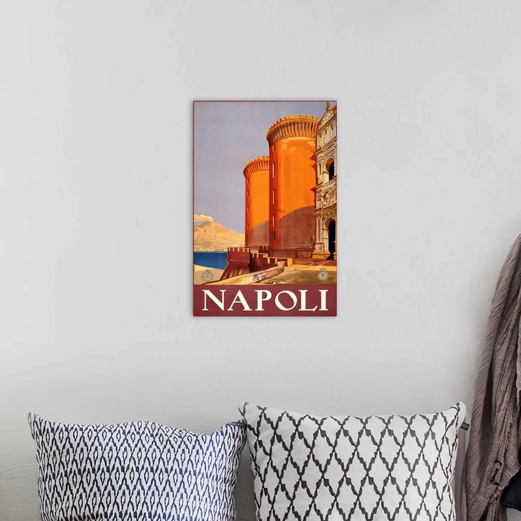 Vintage travel poster for Naples, Italy, showing historic buildings.