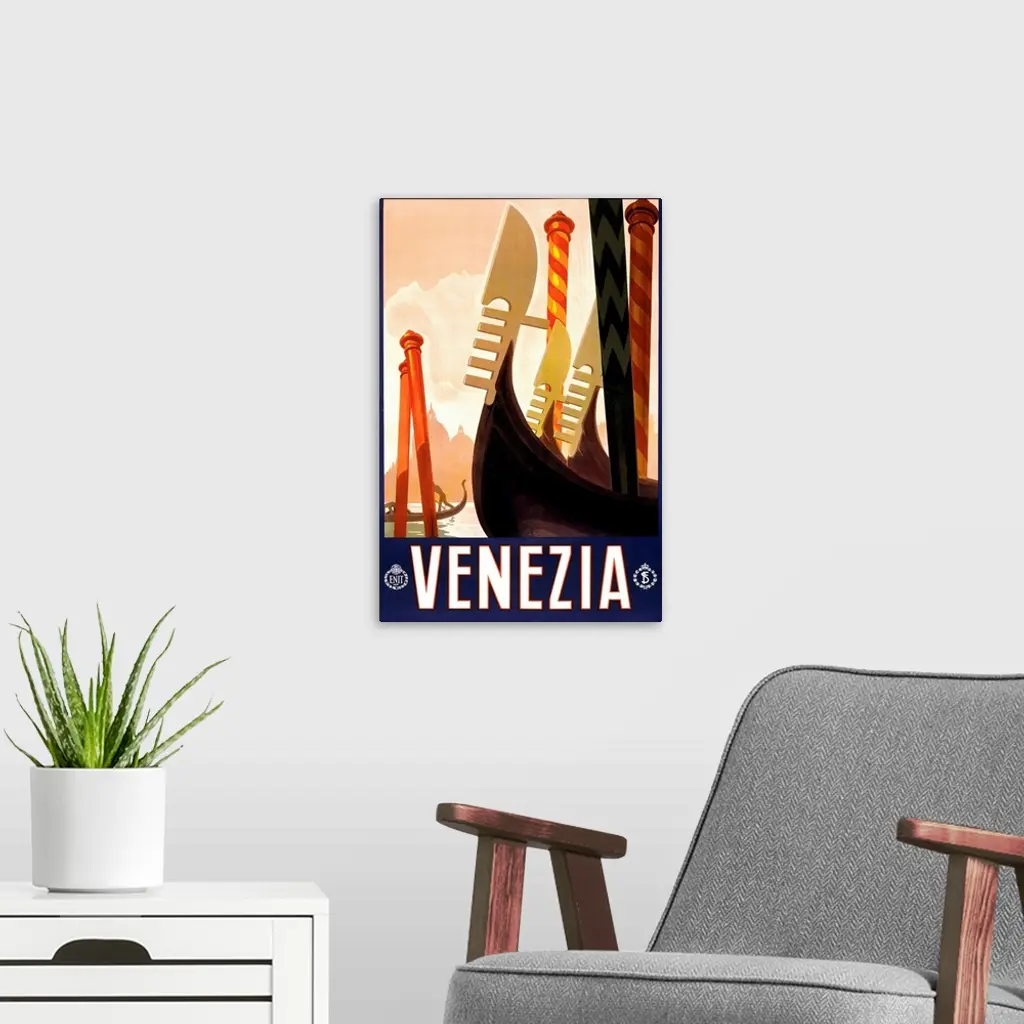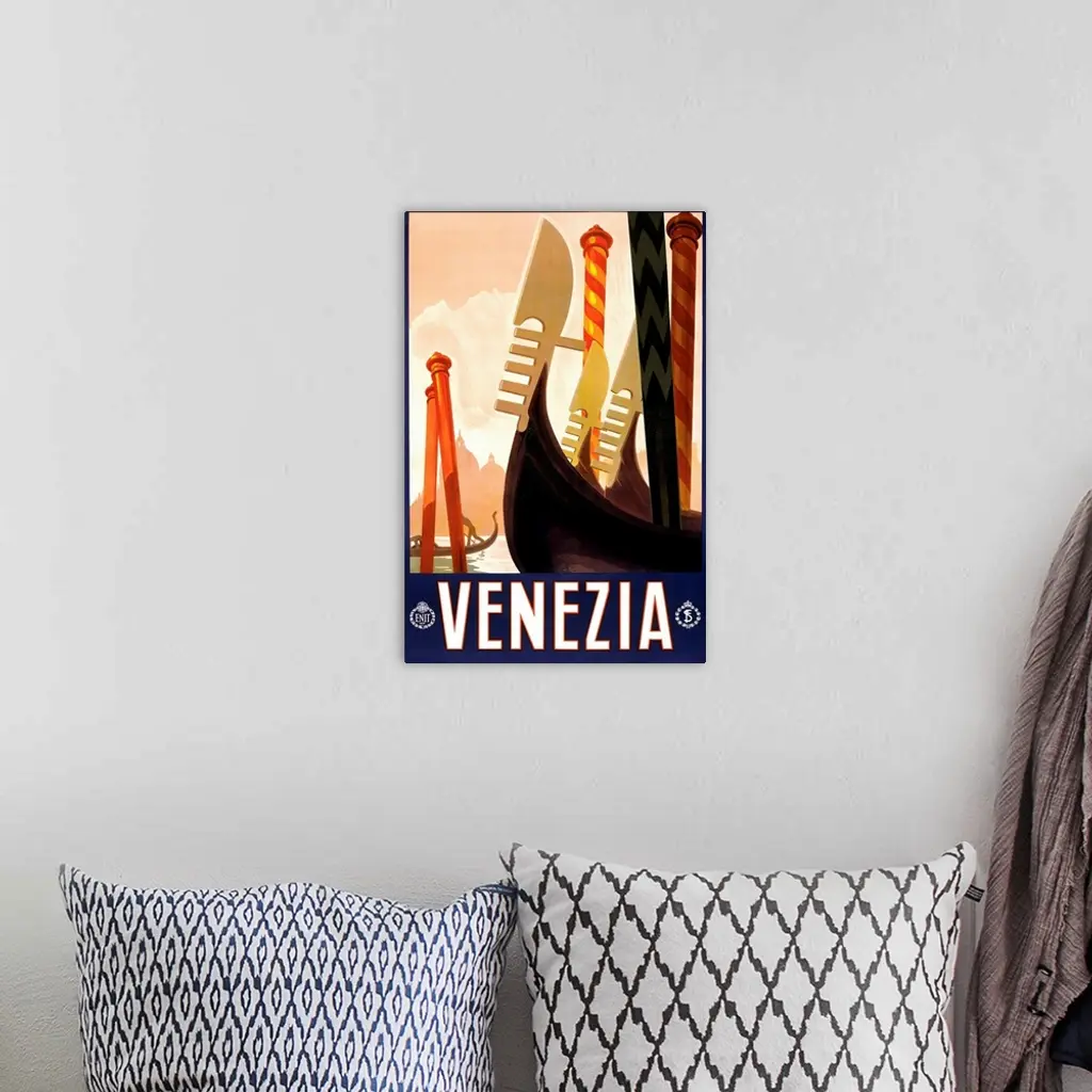 Vintage travel advertisement for Venice, Italy, with gondola bows.