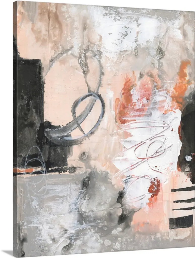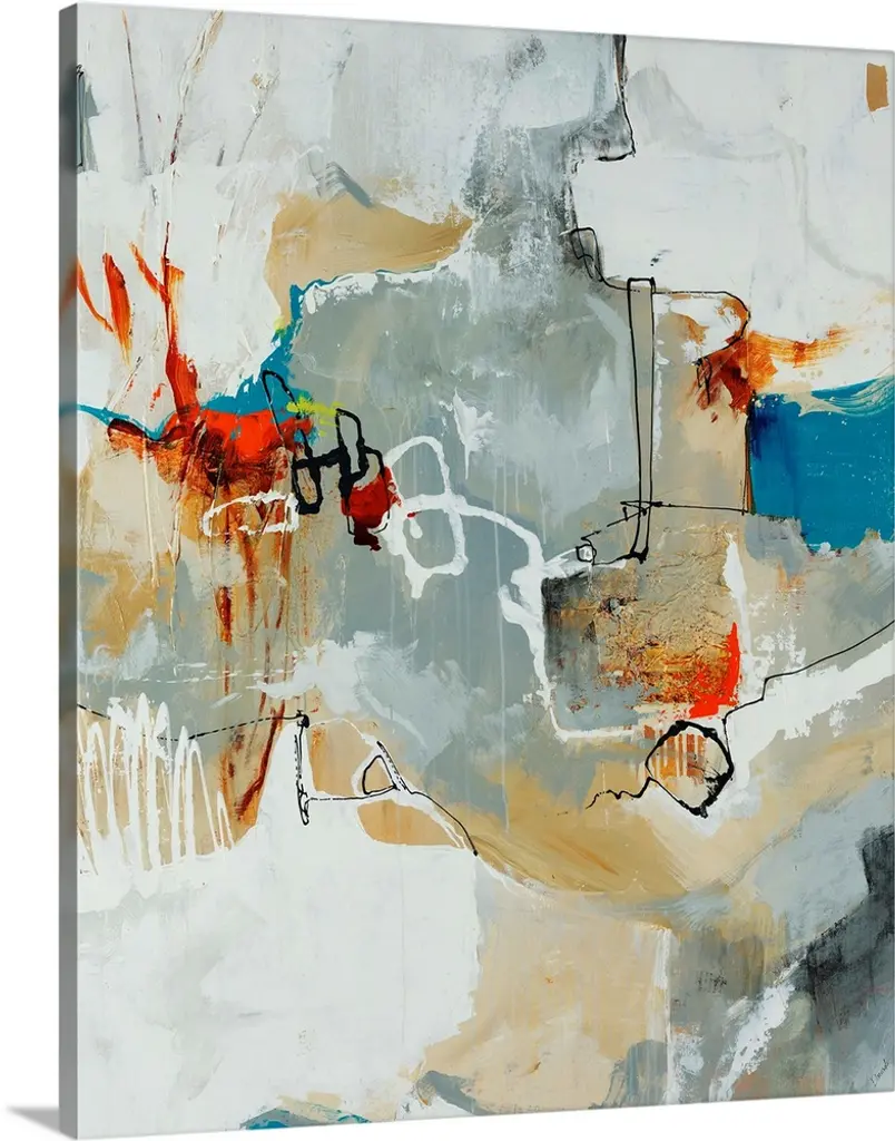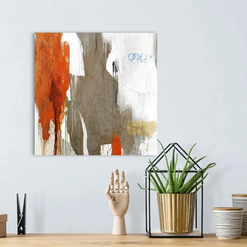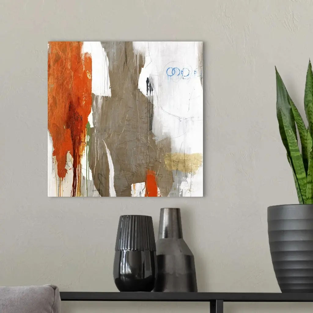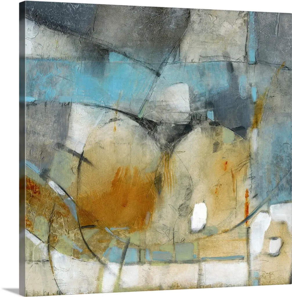Large abstract art with brown, orange, gray, white, blue, and green on a white background.