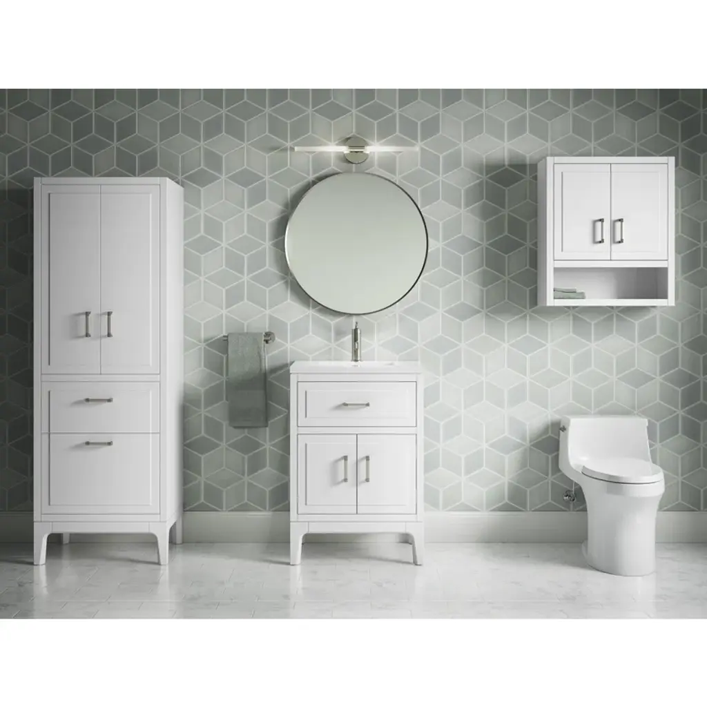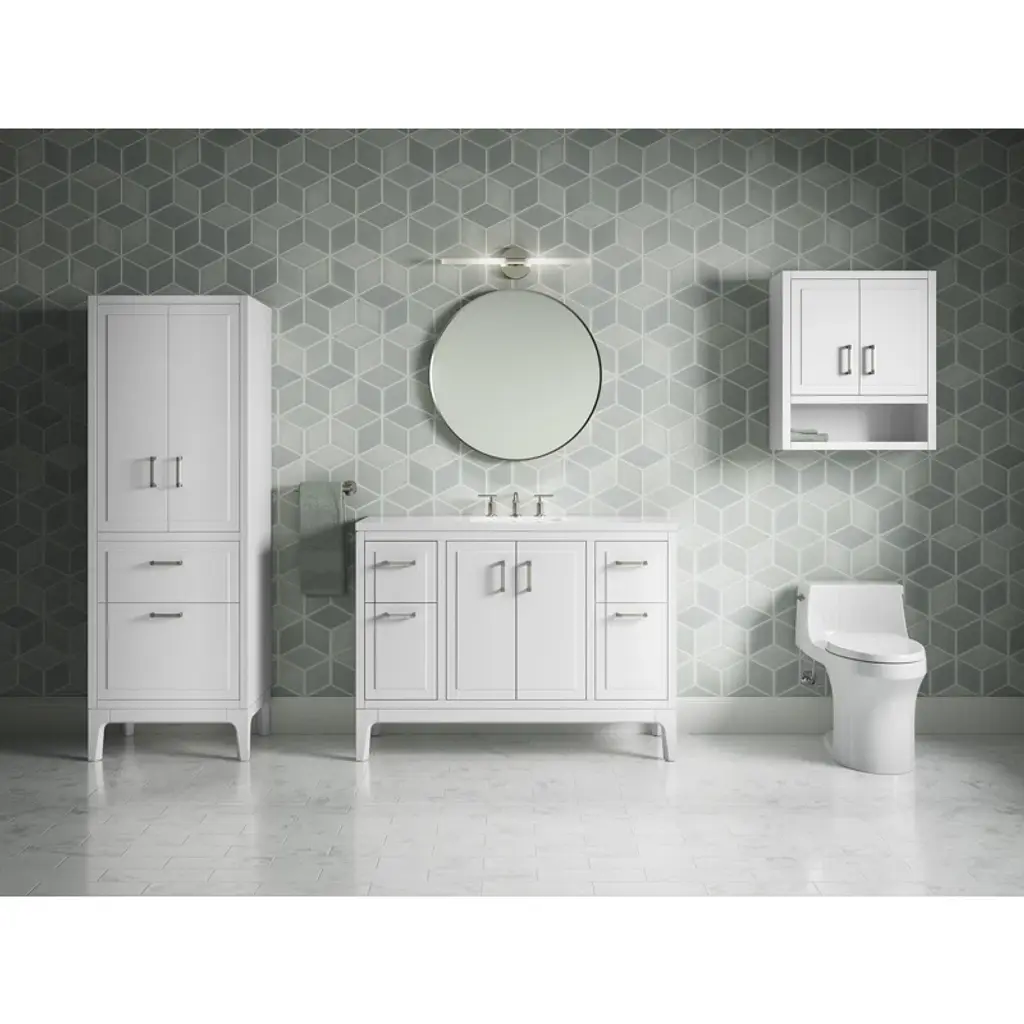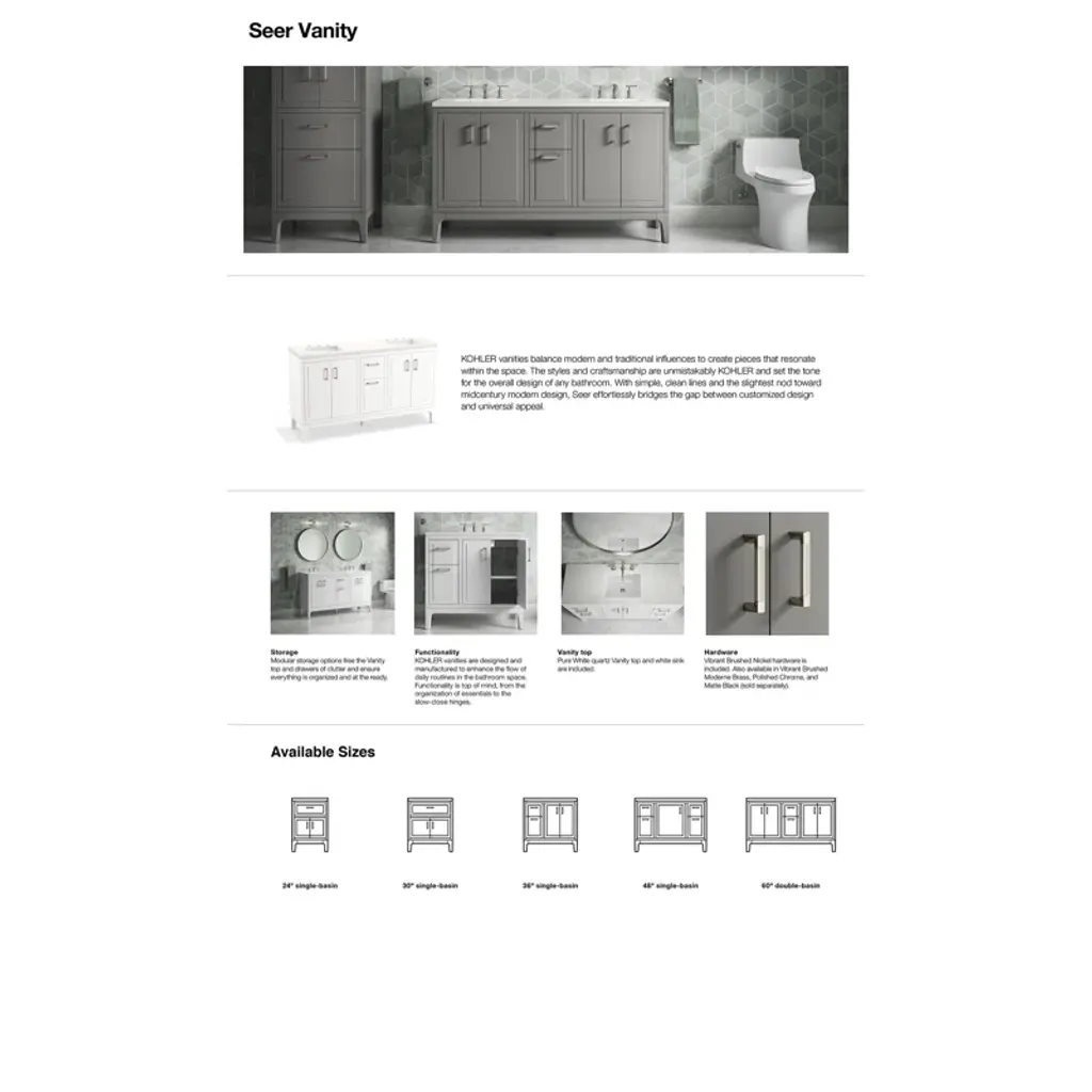 Inspired by midcentury modern design, the Seer bathroom cabinet collection is adorned with elegant lines, subtle textures, and minimalist simplicity, bridging the gap between commonplace and niche. Raised center door and drawer panels add visual interest, along with sharply squared hardware pull featuring subtle details. Linen tower, finish-matched legs, and Vibrant Brushed Nickel hardware are included. Contrasting stained-wood legs and additional hardware finishes are also available.