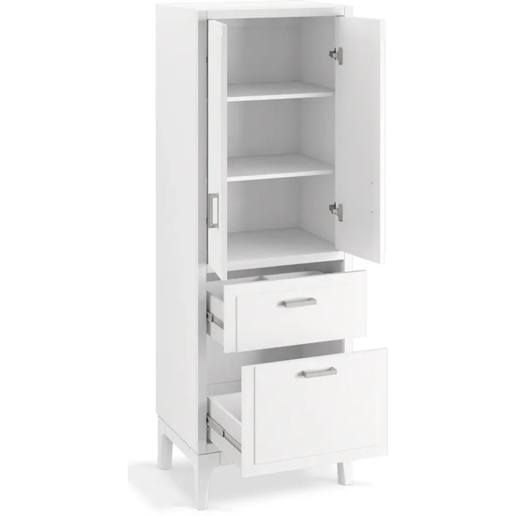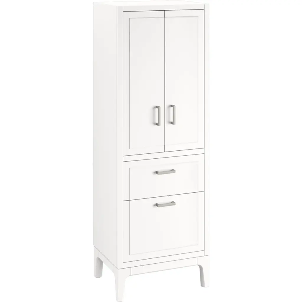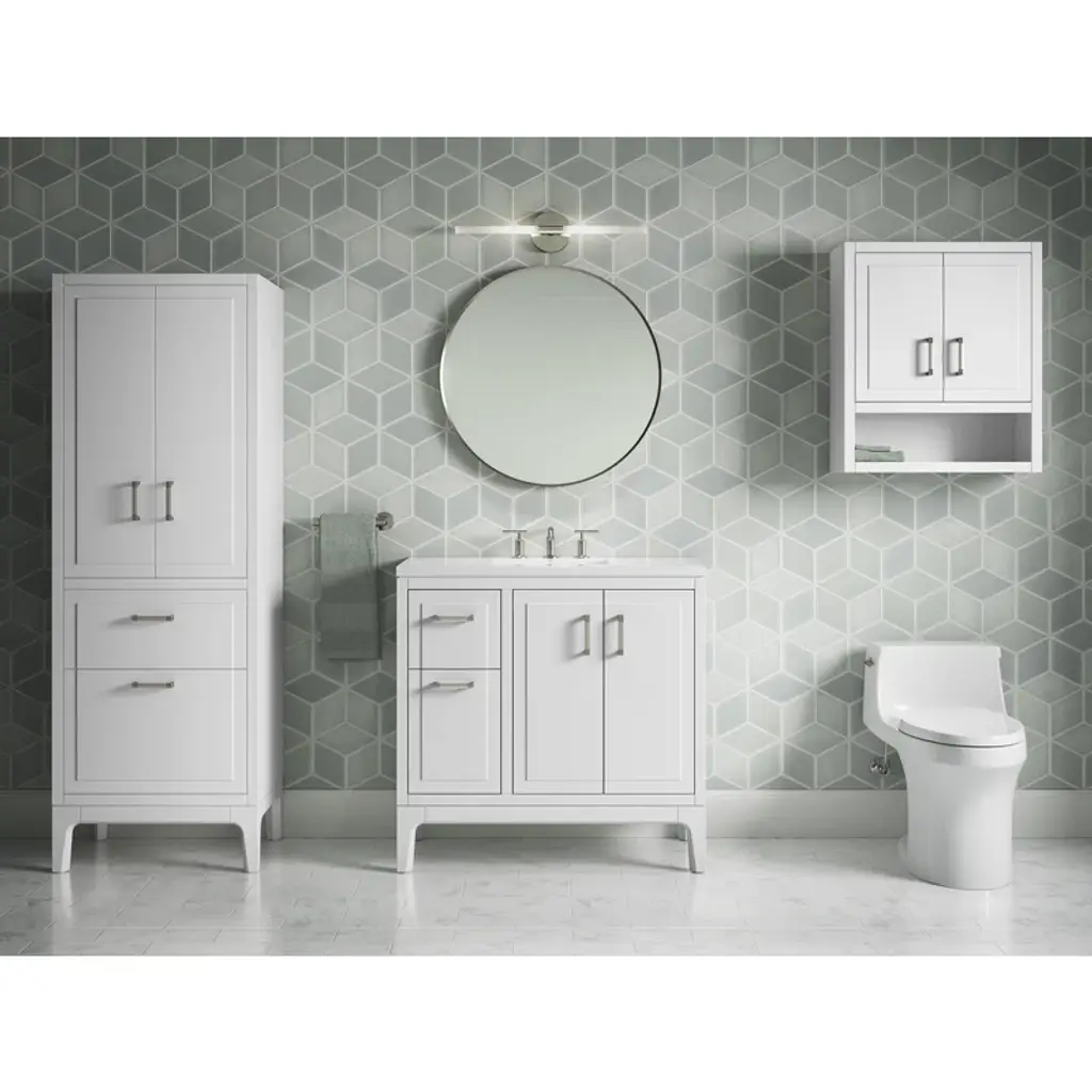 Inspired by midcentury modern design, the Seer bathroom cabinet collection is adorned with elegant lines, subtle textures, and minimalist simplicity, bridging the gap between commonplace and niche. Raised center door and drawer panels add visual interest, along with sharply squared hardware pull featuring subtle details. Linen tower, finish-matched legs, and Vibrant Brushed Nickel hardware are included. Contrasting stained-wood legs and additional hardware finishes are also available.