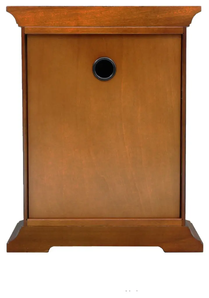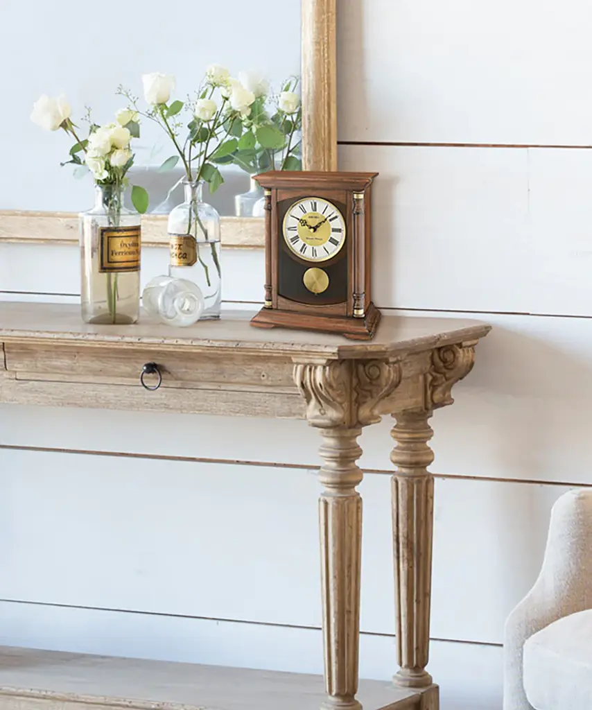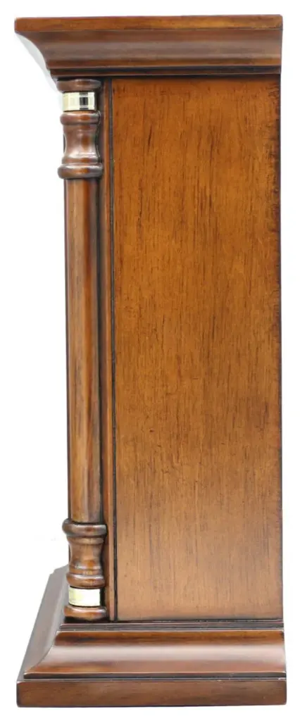 The charming and classic design of this clock adds elegance to any space. The medium-brown wooden case complements any decor, and the crystal glass cover on a door opens to a pendulum with a gleaming gold finish. Each quarter-hour you"™ll hear the Westminster/Whittington chimes, whose volume is easily controlled to your preference and can be silenced during the night. The pendulum volume is also easily adjusted.