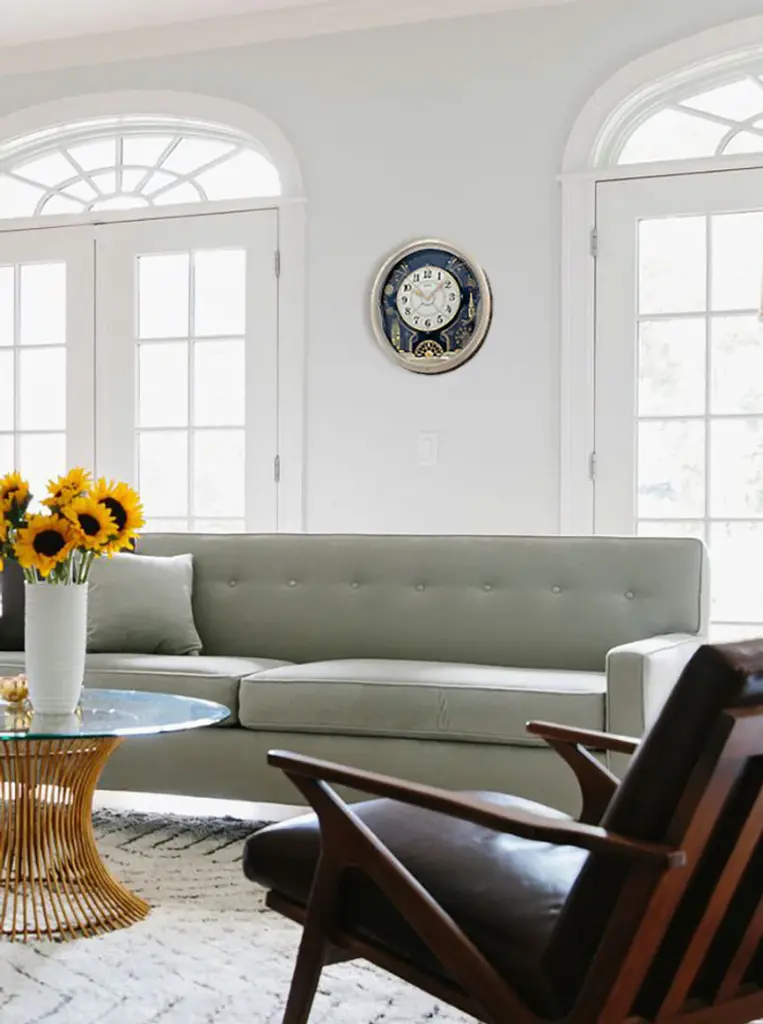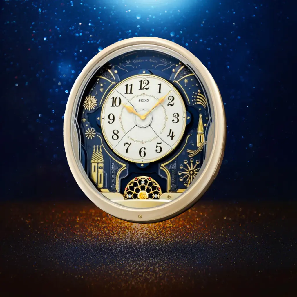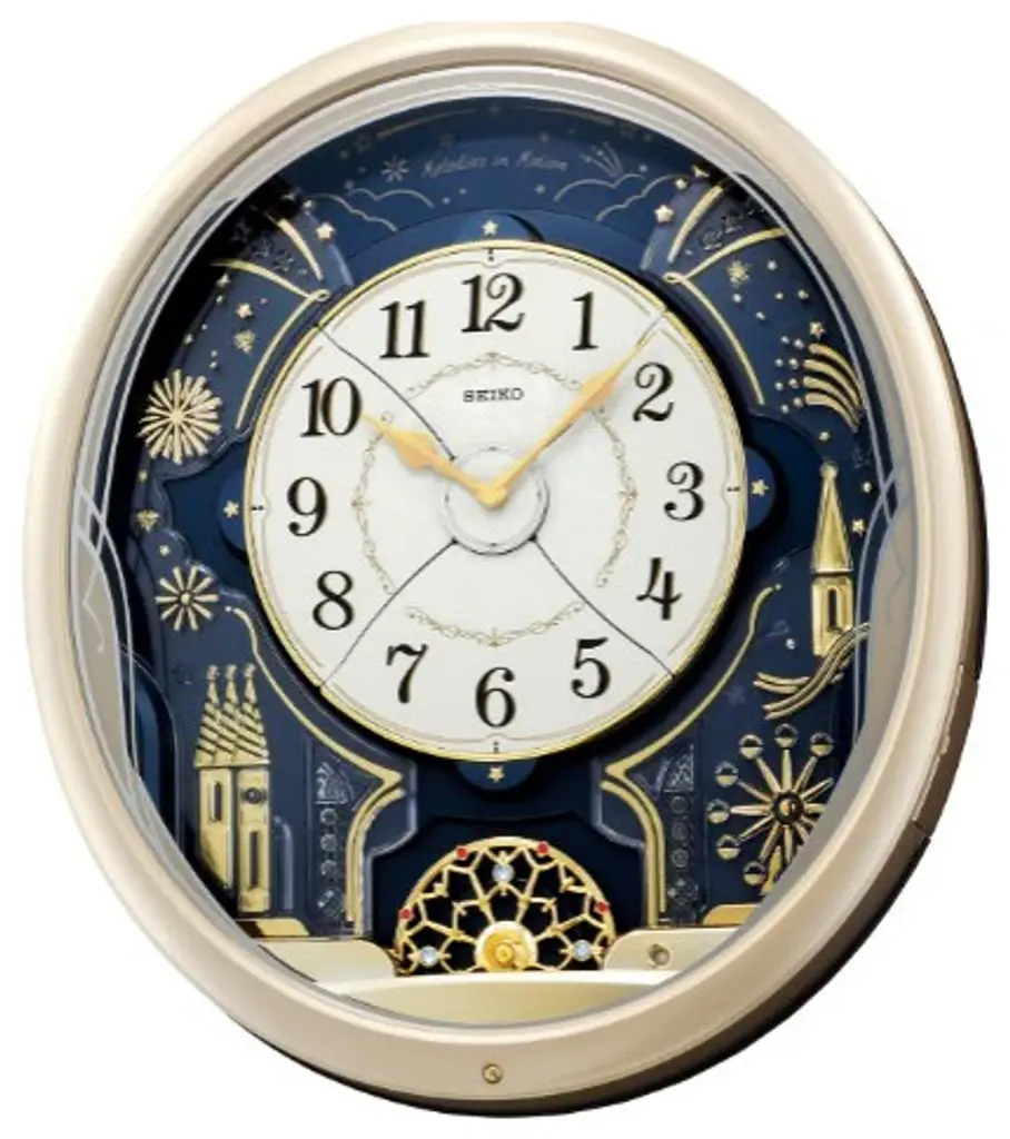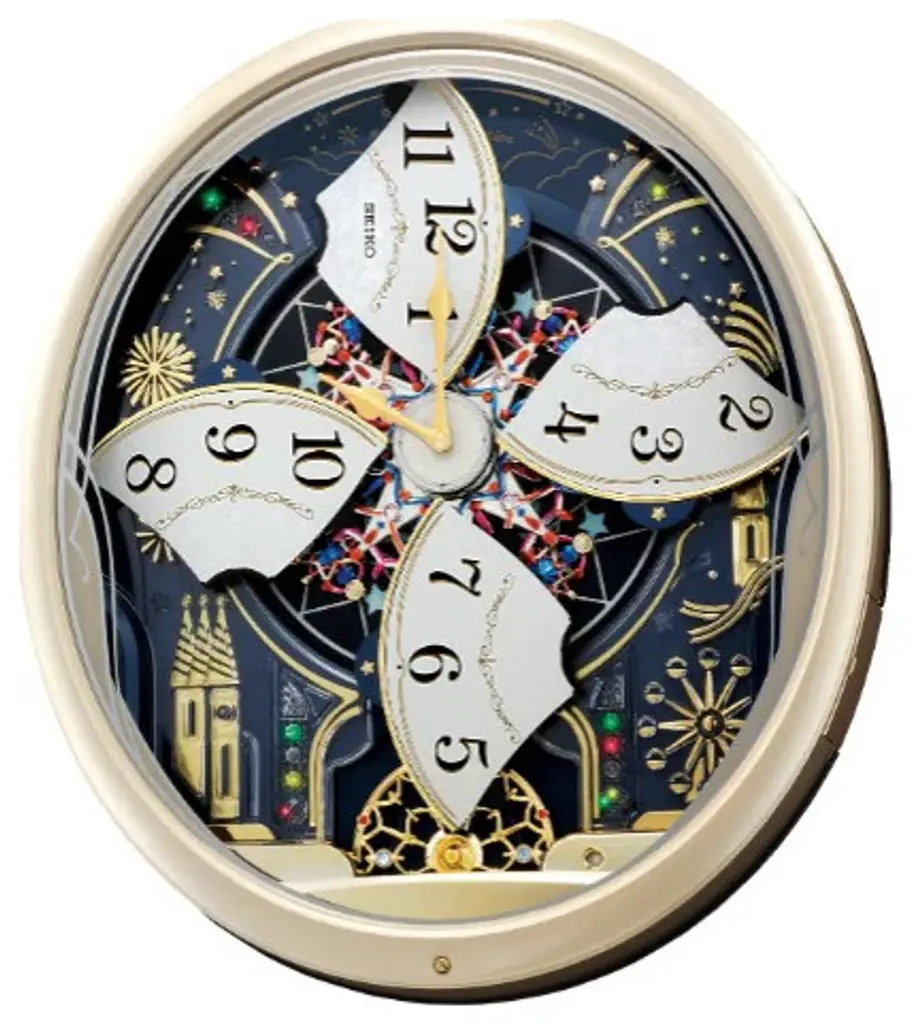 Seiko''s Melodies in Motion Clocks are enchanting and magical. This clock brings the magic of a starry night to life. On the hour, the dial opens to reveal a turning decorative wheel and plays one of six Hi-Fi melodies plus an opening and ending melody. It has a metallic silver case, a demonstration button, and volume control. This clock is enclosed in glass, the pendulum features Swarovski crystals, and an off/on switch. This clock will light up your house year-round.