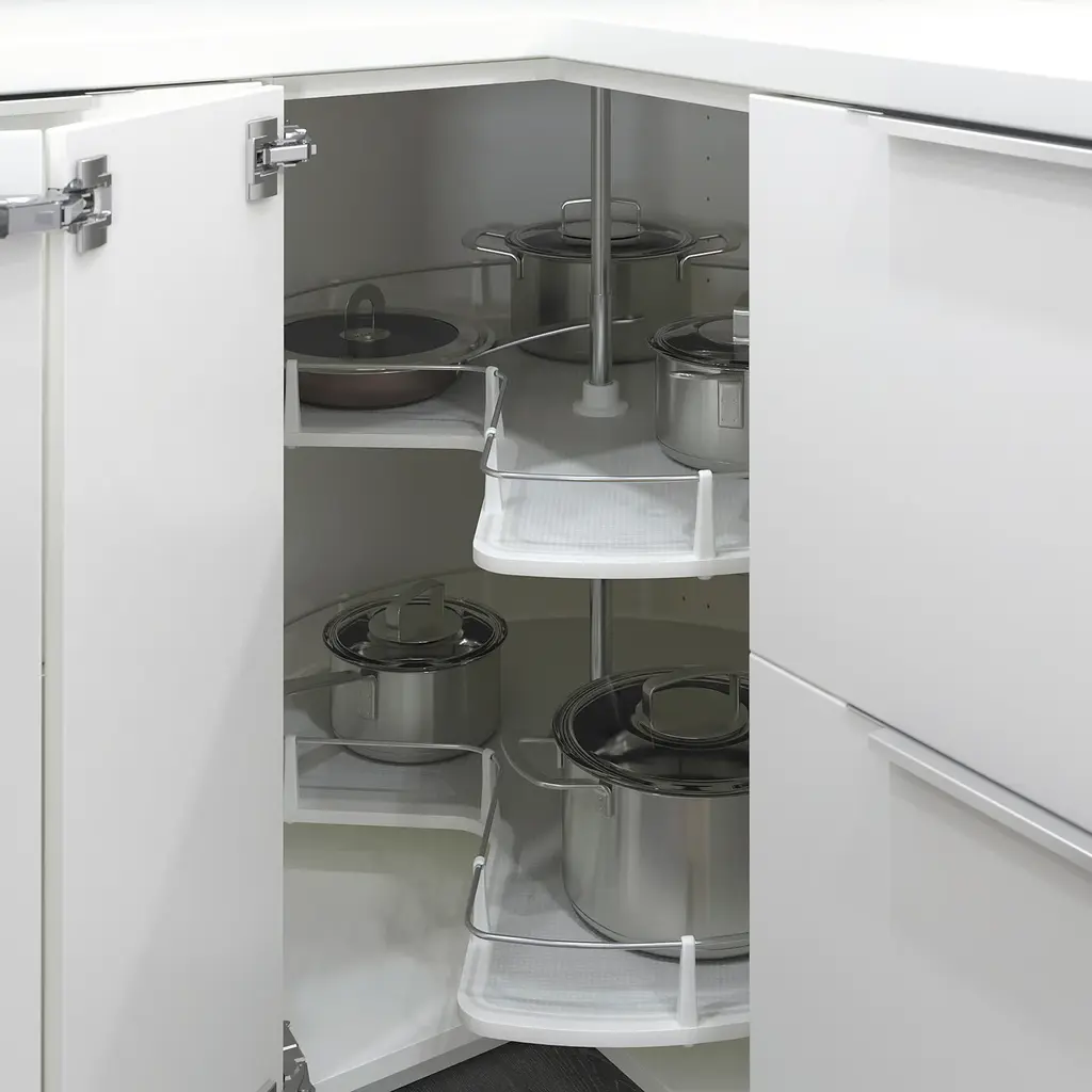 SEKTION Corner base cabinet with carousel - white/Axstad matte white 38x24x30 ". The shelves can be moved vertically and rotated to make it easier for you to access what you need. Ideal for storing things like pots, pie plates, and dry goods. Sturdy frame construction, ¾" thick.