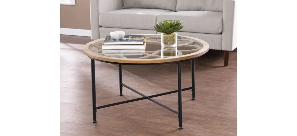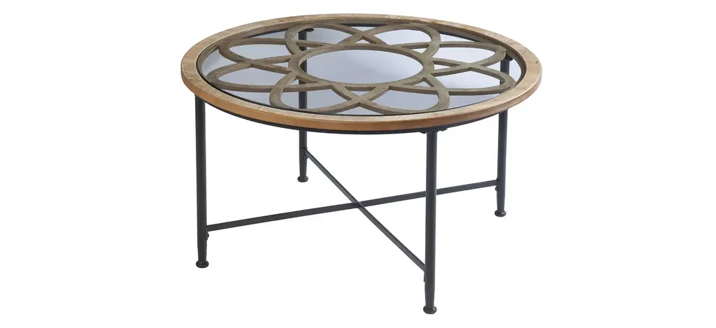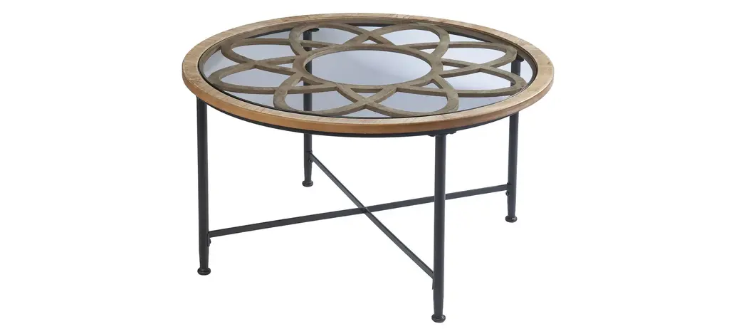 Selena Round Cocktail Table add unique flair to your living space with this round cocktail table. A spacious glass tabletop offers plenty of room for your serving tray or magazine collection, while the floral-inspired design underneath creates a rustic look. X-shaped crossbars bring a classic feel to your space, highlighting modern farmhouse style in your family room or open concept floorplan. Cross country chic off your list when you bring home this glass-top coffee table.