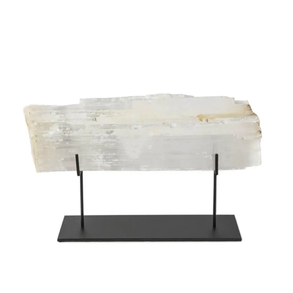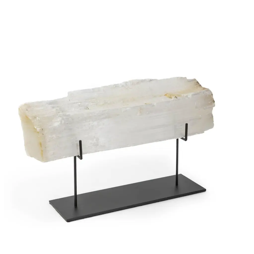 Beautiful Selenite Log on a Custom Black Stand. Uniquely shaped, real sourced selenite. Finish on Base is Matte Black